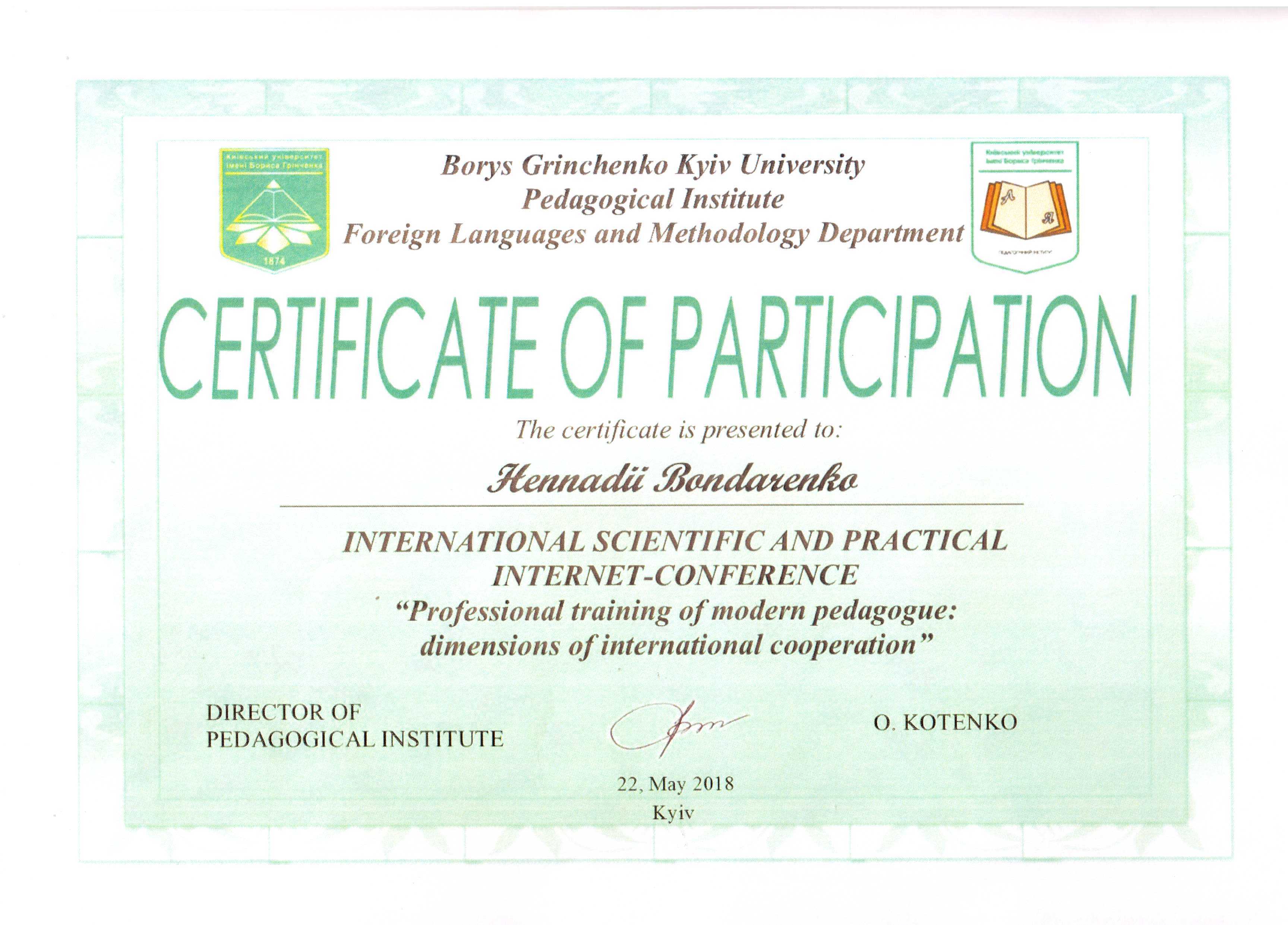 | 3333 | Міжнародна науково-практична інтернет-конференція "Професійна підготовка сучасного педагога: виміри міжнародного співробітництва" | Підготовка вчителя початкової школи до риторизації освітнього процесу | м. Київ, Київський університет імені Бориса Грінченка |