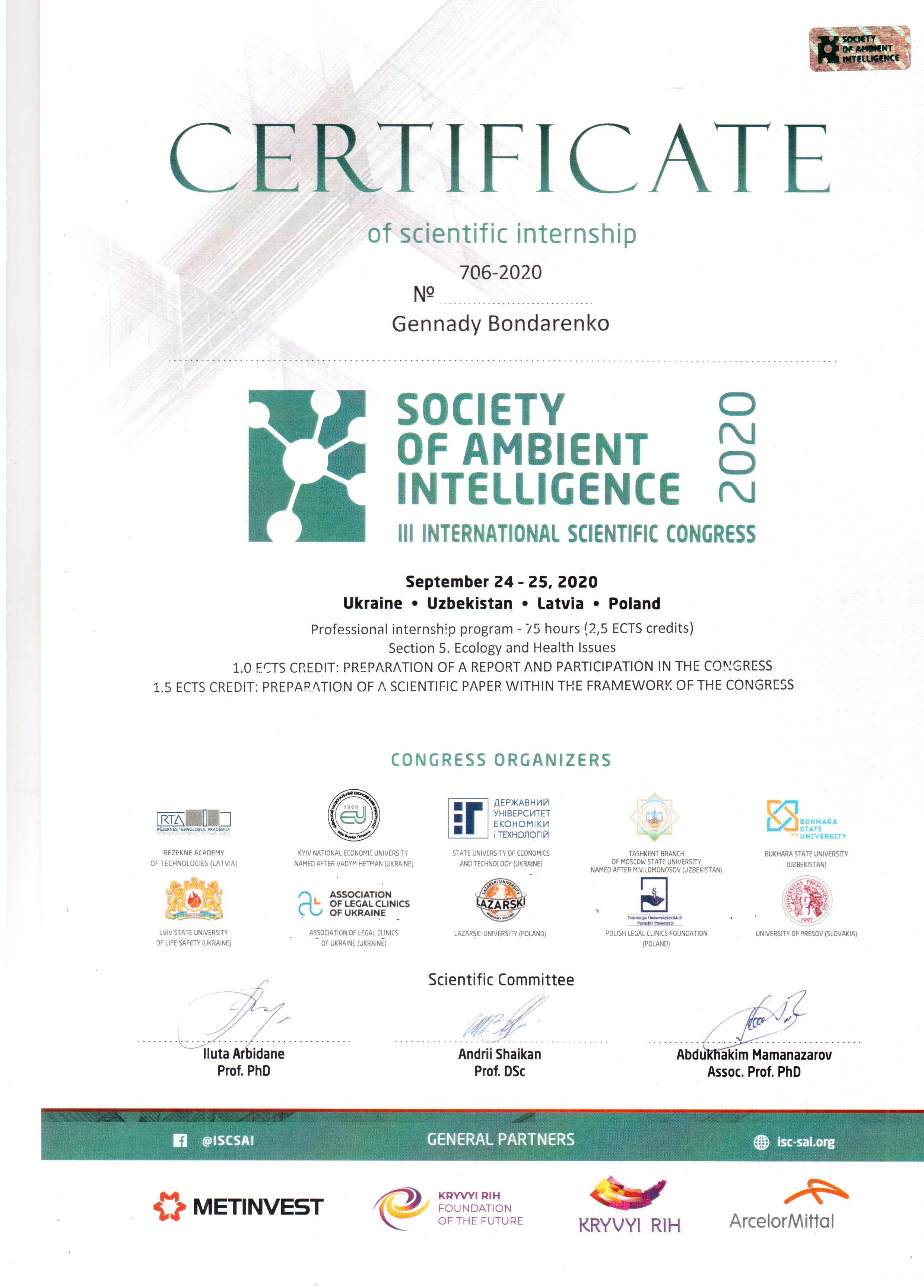 | 5524 | III Міжнародний науковий конгрес «SOCIETY OF AMBIENT INTELLIGENCE 2020» (ISC-SAI 2020) | «Health-saving competence of future primary school teachers: indicators of development» | Україна - Узбекистан - Латвія - Польща |