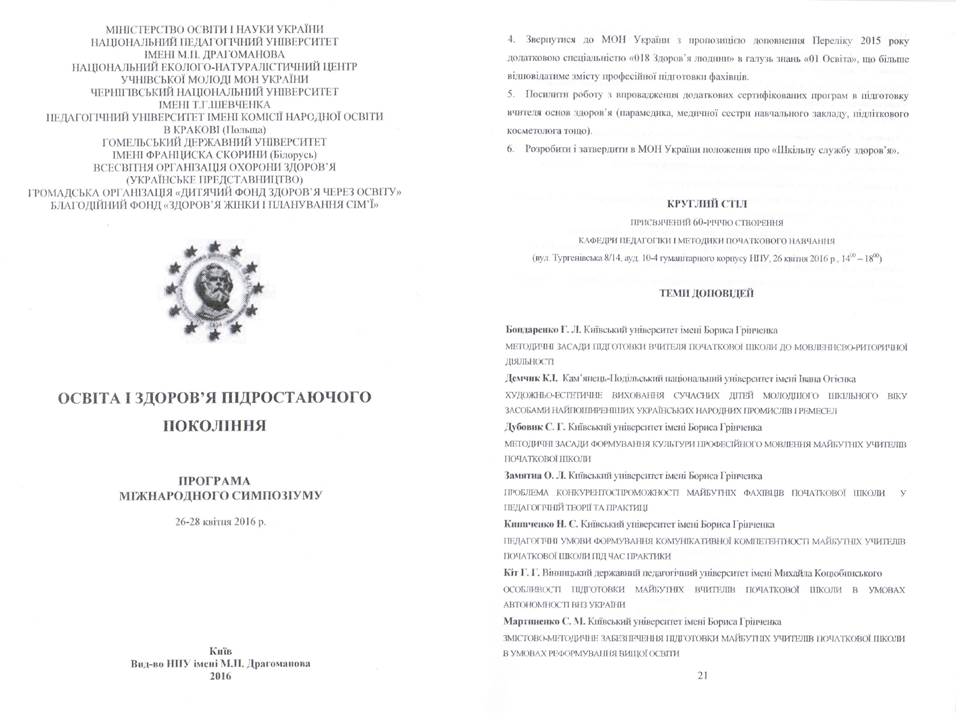 | 64 | Міжнародний симпозіум 'Освіта і здоров'я підростаючого покоління' | Методичні засади підготовки вчителя початкової школи до мовленнєво-риторичної діяльності | м. Київ, Національний педагогічний університет імені М.П.Драгоманова |