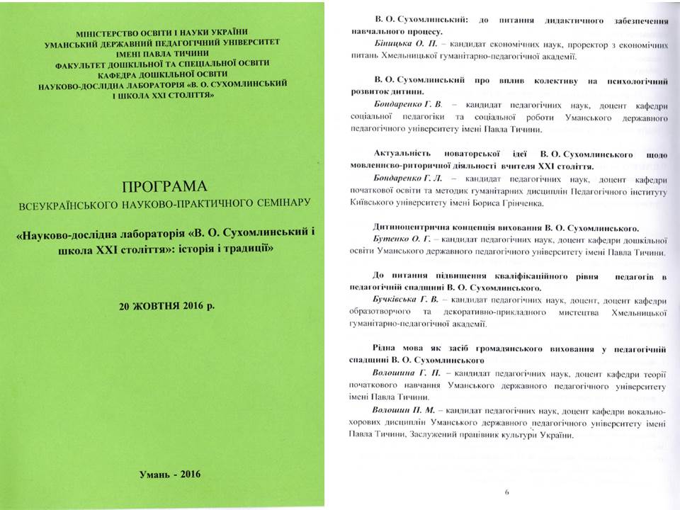 | 65 | Всеукраїнський науково-пракичний семінар 'Науково-дослідна лабораторія В.О.Сухомлинський і школа ХХІ століття: історія і традиції'. | Актуальність новаторських ідей В.О.Сухомлинського щодо мовленнєво-риторичної діяльності вчителя ХХІ століття | Умань, Уманський державний педагогічний університет імені Павла Тичини |