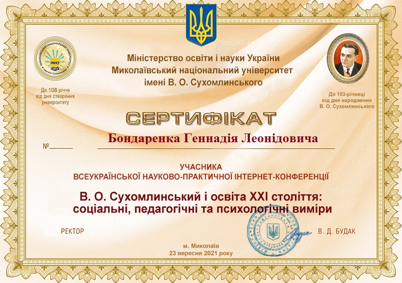 | 7319 | Всеукраїнська науково-практична інтернет конференція "В.О.Сухомлинський і освіта ХХІ століття: соціальні, педагогічні та психологічні виміри" | Аналіз педагогічних поглядів Василя Сухомлинського з проблеми мовленнєво-риторичної діяльності сучасного вчителя | Миколаївський національний університет імені В.О,Сухомлинського |