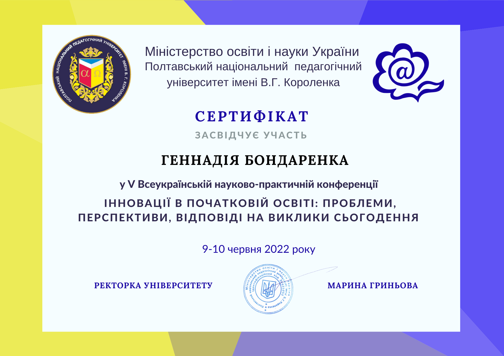 | 8084 | V Всеукраїнська науково-практична конференція з міжнародною участю "Інновації в початковій освіті: проблеми, перспективи, відповіді на виклики сьогодення" | Інноваційна модель професійної підготовки вчителя початкових класів у Педагогічному інституті Університету Грінченка | Полтавський національний педагогічний університет імені В.Короленка |