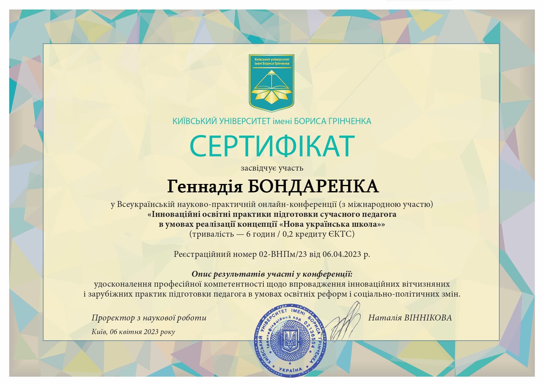 | 9525 | Всеукраїнська науково-практична конференція (з міжнародною участю) «ФРЕБЕЛІВСЬКА ПЕДАГОГІКА В СУЧАСНІЙ ОСВІТІ: ВИМОГИ, ТРЕНДИ, ПЕРСПЕКТИВИ» | Інноваційний освітній простір Університету Грінченка як чинник професійної підготовки педагога. | Херсон, Івано-Франківськ | document.pdf | |