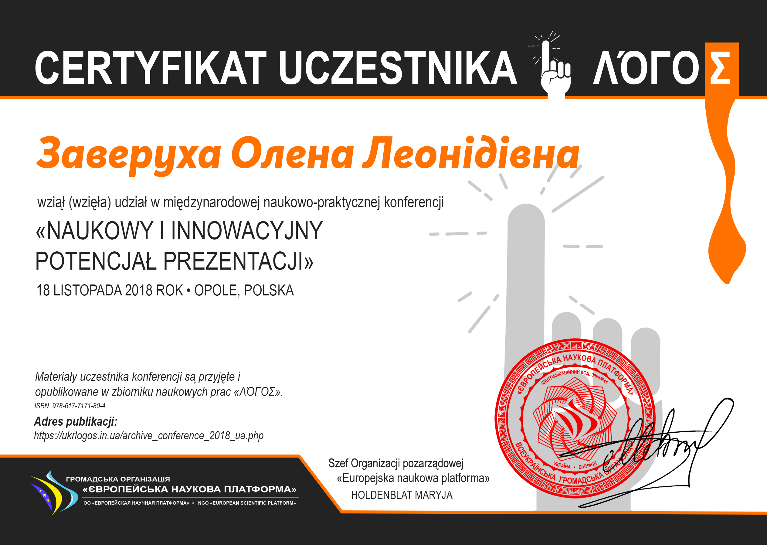 | 3408 | Naukowy i innowacyjny potencjał prezentacji | Współczesne pismo chóralne w twórczości polskich kompozytorów: poszukiwanie, ukierunkowanie, nowatorstwo | Європейська наукова платформа "Логос" м. Ополе, Польща |