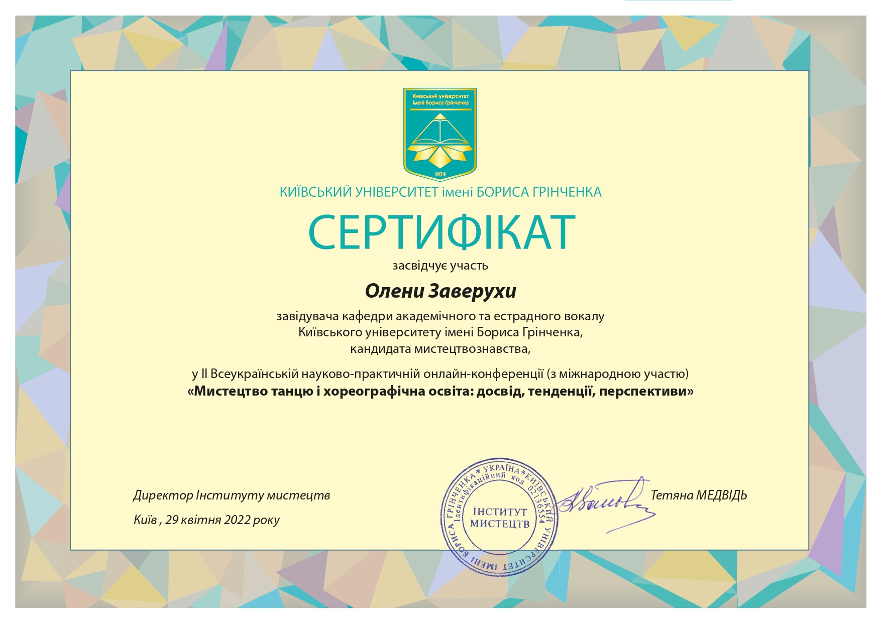 | 7979 | Мистецтво танцю і хореографічна освіта досвід, тенденції, перспективи | Елементи сценічного руху на заняттях вокального ансамблю | Київський університет імені Бориса Грінченка |