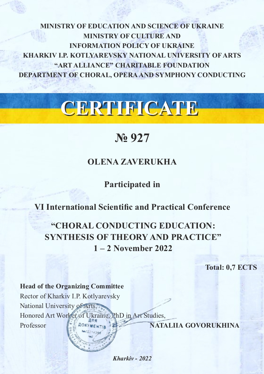| 510 | Факультет музичного мистецтва і хореографії | Кафедра академічного та естрадного вокалу | 7.7 | 1 | 2025 | https://www.researchgate.net/profile/Olena_Zaverukha |