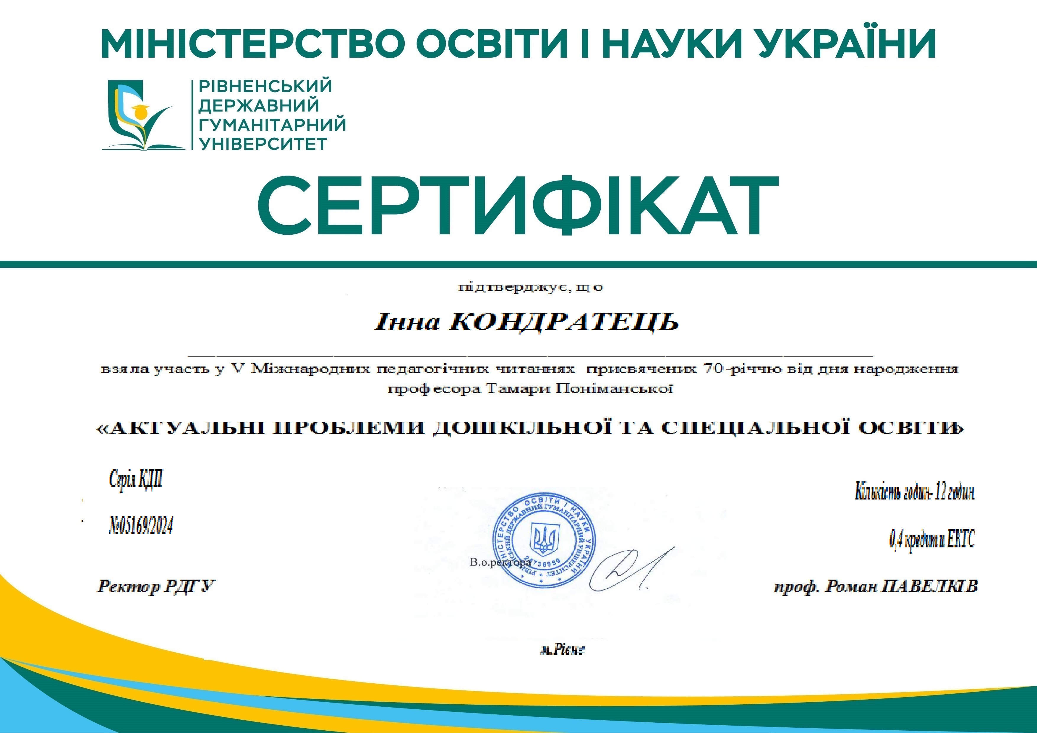| 11413 | V Міжнародні педагогічні читання, присвячені 70-річчю від дня народження професора Тамари Поніманської «Актуальні проблеми дошкільної та спеціальної освіти» | Гуманізація сучасного дошкільного простору: психолого-педагогічний супровід майбутніх вихователів. | Рівне |