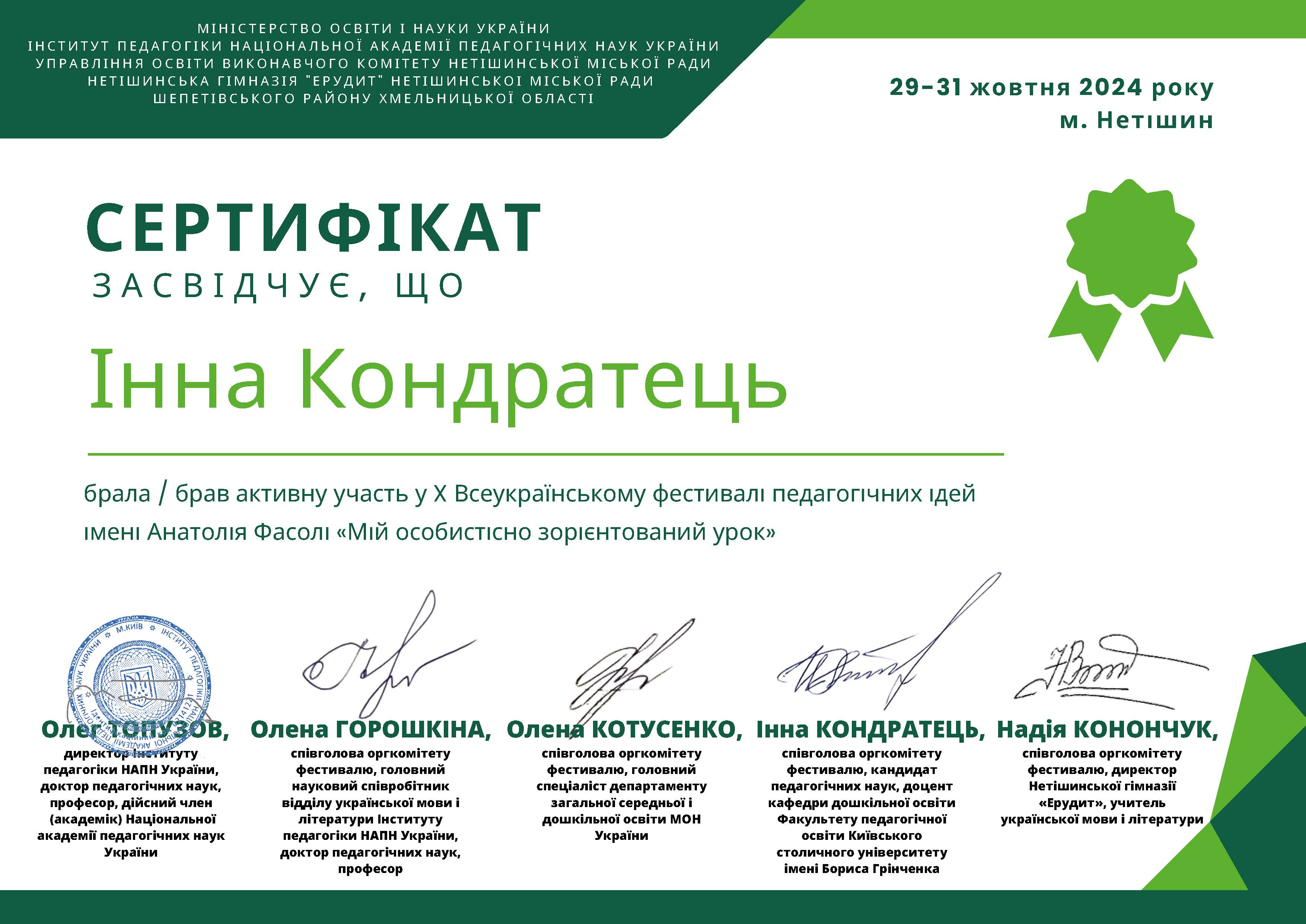 | 11415 | X Всеукраїнський фестиваль педагогічних ідей імені Анатолія Фасолі. | Рефлексійна культура педагога | м. Нетішин |
