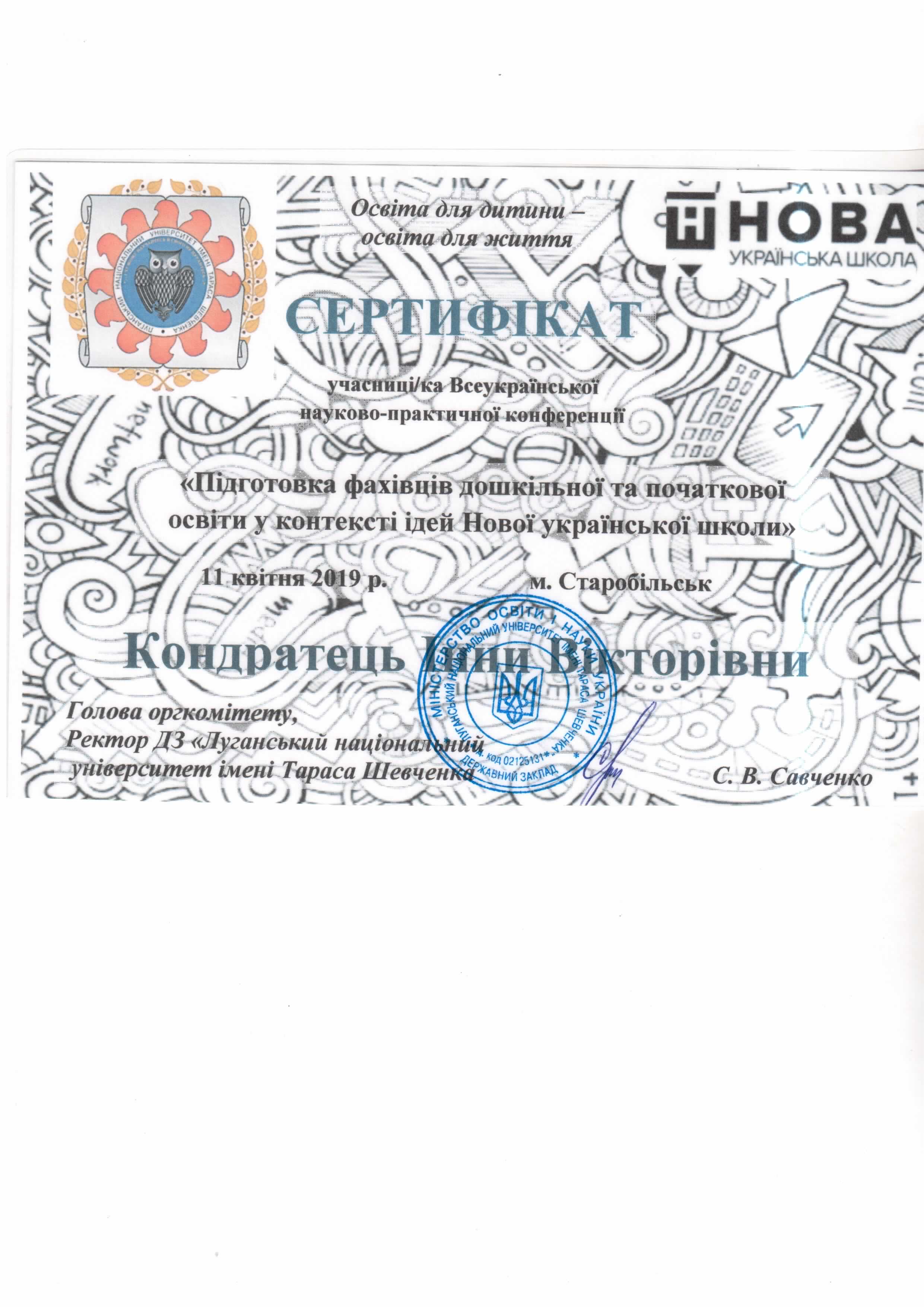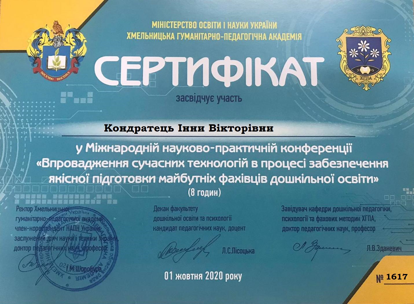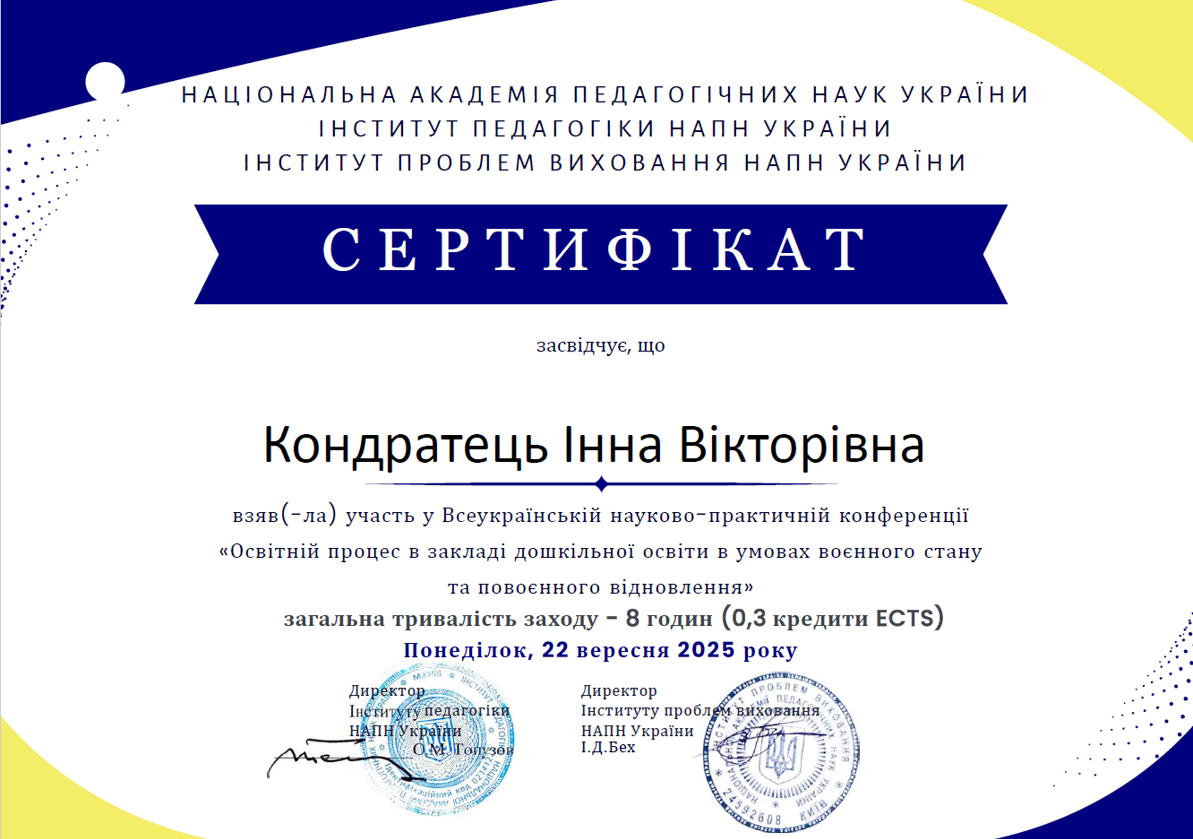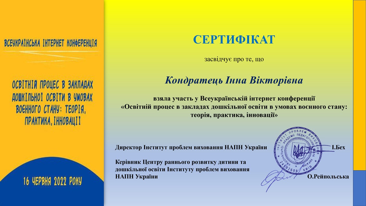 | 9582 | Всеукраїнський круглий стіл «Сучасний заклад дошкільної освіти: лідерство, диджиталізація, майбутній капітал» | учасник | м.Київ |