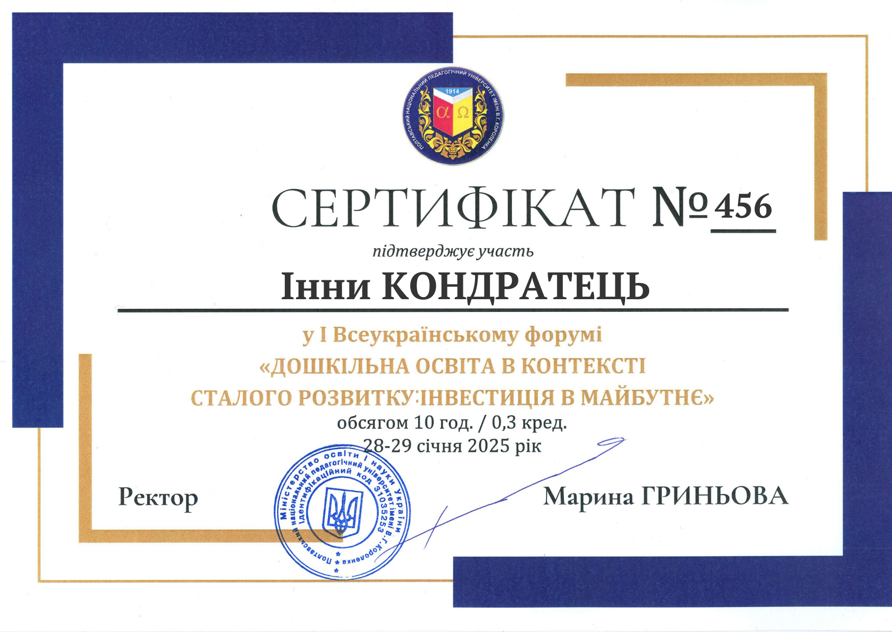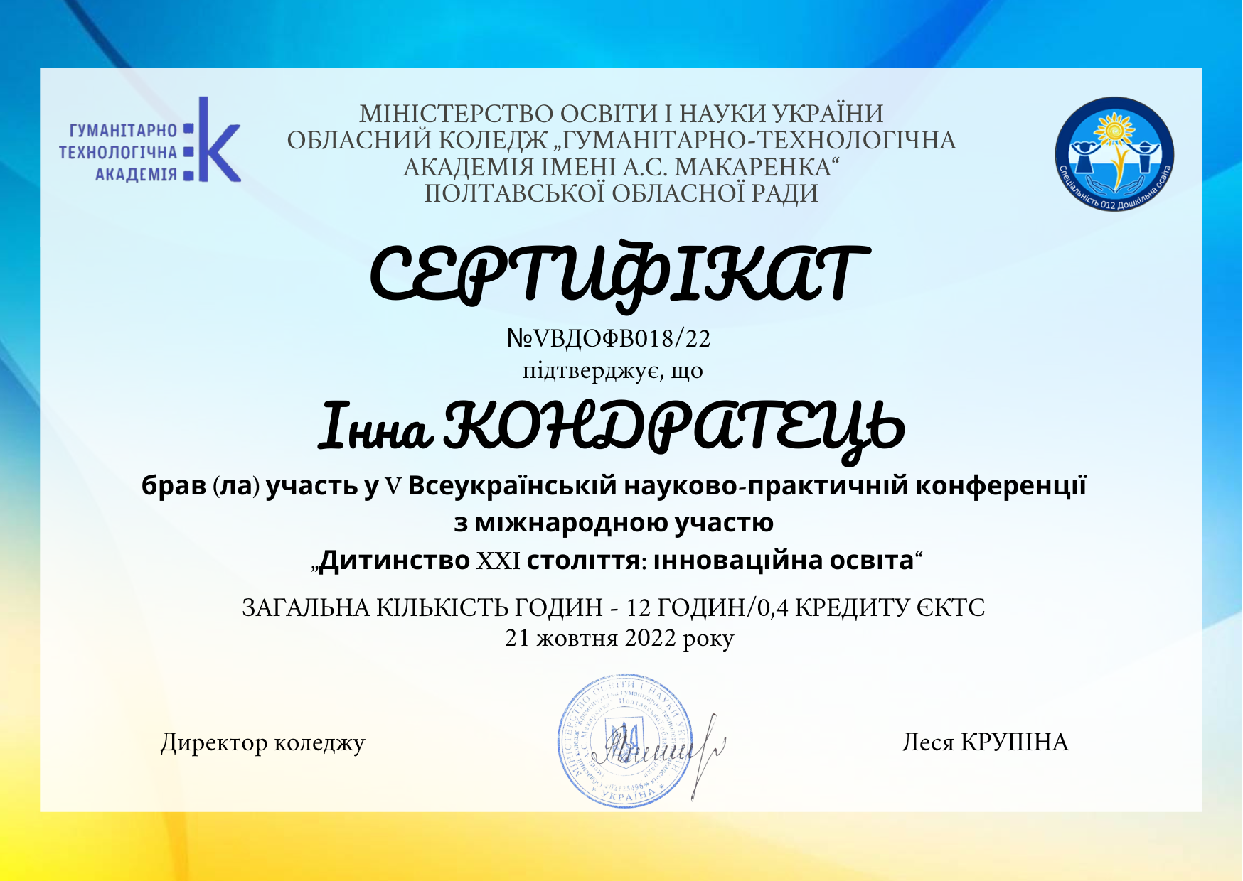 | 11918 | I Всеукраїнський форум "Дошкільна освіта в контексті сталого розвитку: інвестиція в майбутнє | Психолого-педагогічний супровід майбутніх вихователів у створенні літературоцентрованого середовища для дітей раннього віку | Полтава |