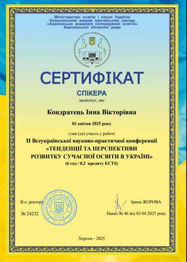 | 11919 | ІІ Всеукраїнська науково-практична конференція «Тенденції та перспективи Розвитку сучасної освіти в Україні» | Педагогічний супровід дитячого слововідкриття в умовах українського білінгвізму | Херсон |