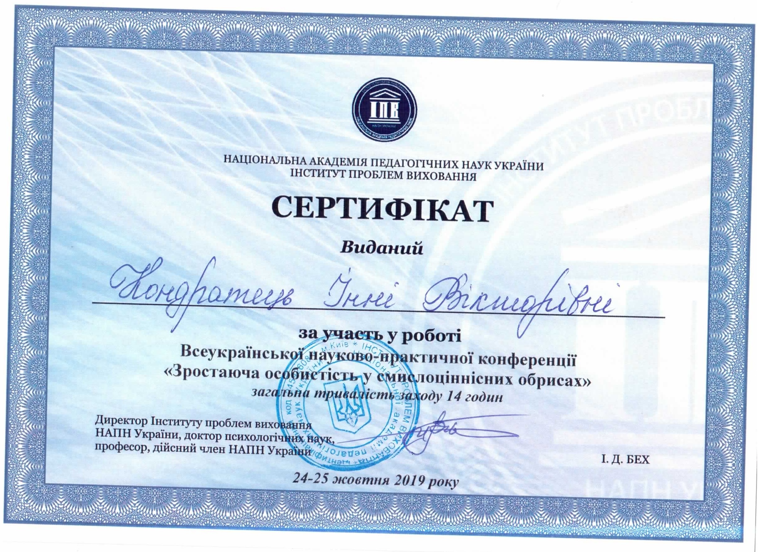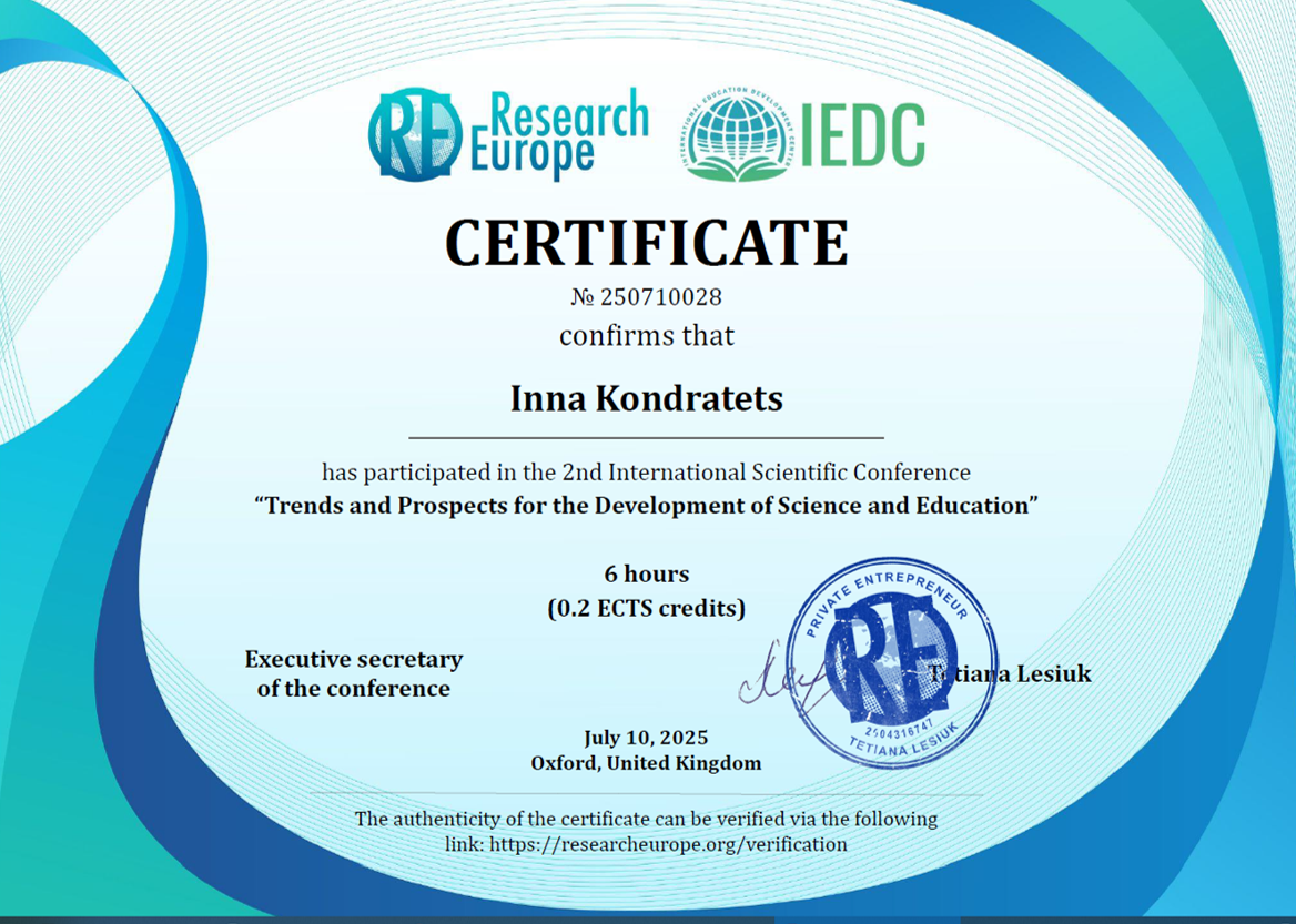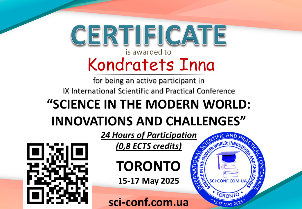 | 11920 | IX International Scientific and Practical Conference SCIENCE IN THE MODERN WORLD: INNOVATIONS AND CHALLENGES | Готовність вихователів і майбутніх вихователів до ролі трансляторів читацької культури в організації літературної діяльності дітей раннього і дошкільного віку | Торонто, Канада |