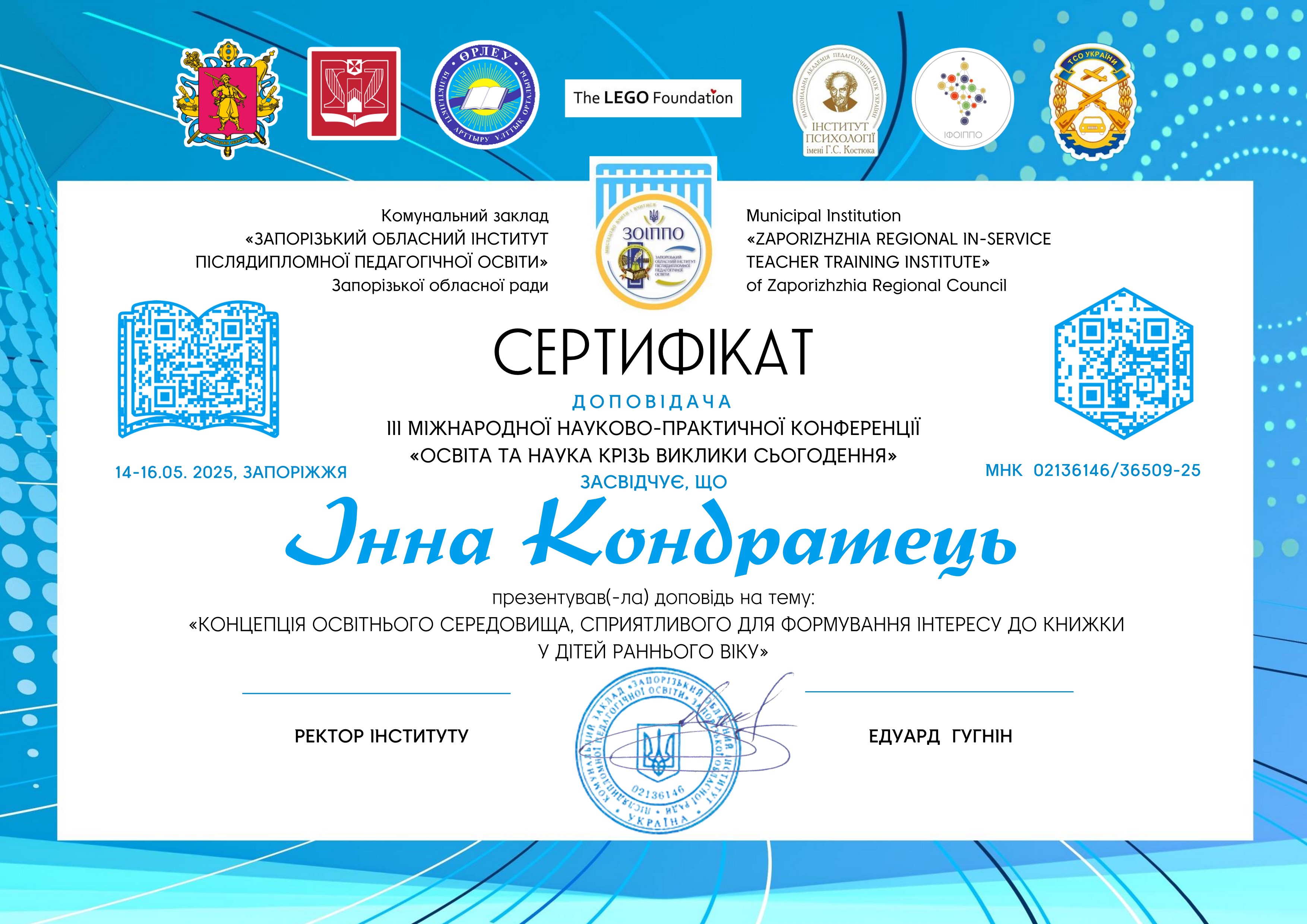 | 11924 | III Міжнародна науко-практична конференція "Освіта та наука крізь виклики сьогодення" | Концепція освітнього середовища, сприятливого для формування інтересу до книжки у дітей раннього віку | Запоріжжя |