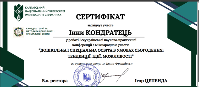 | 12068 | Всеукраїнська науково-практична конференція з міжнародною участю «Дошкільна і спеціальна освіта в умовах сьогодення: тенденції, ідеї, можливості» | Психолого-педагогічний супровід дітей раннього і дошкільного віку в проявах почуттів і емоційному сприйнятті Світу | Івано-Франківськ |