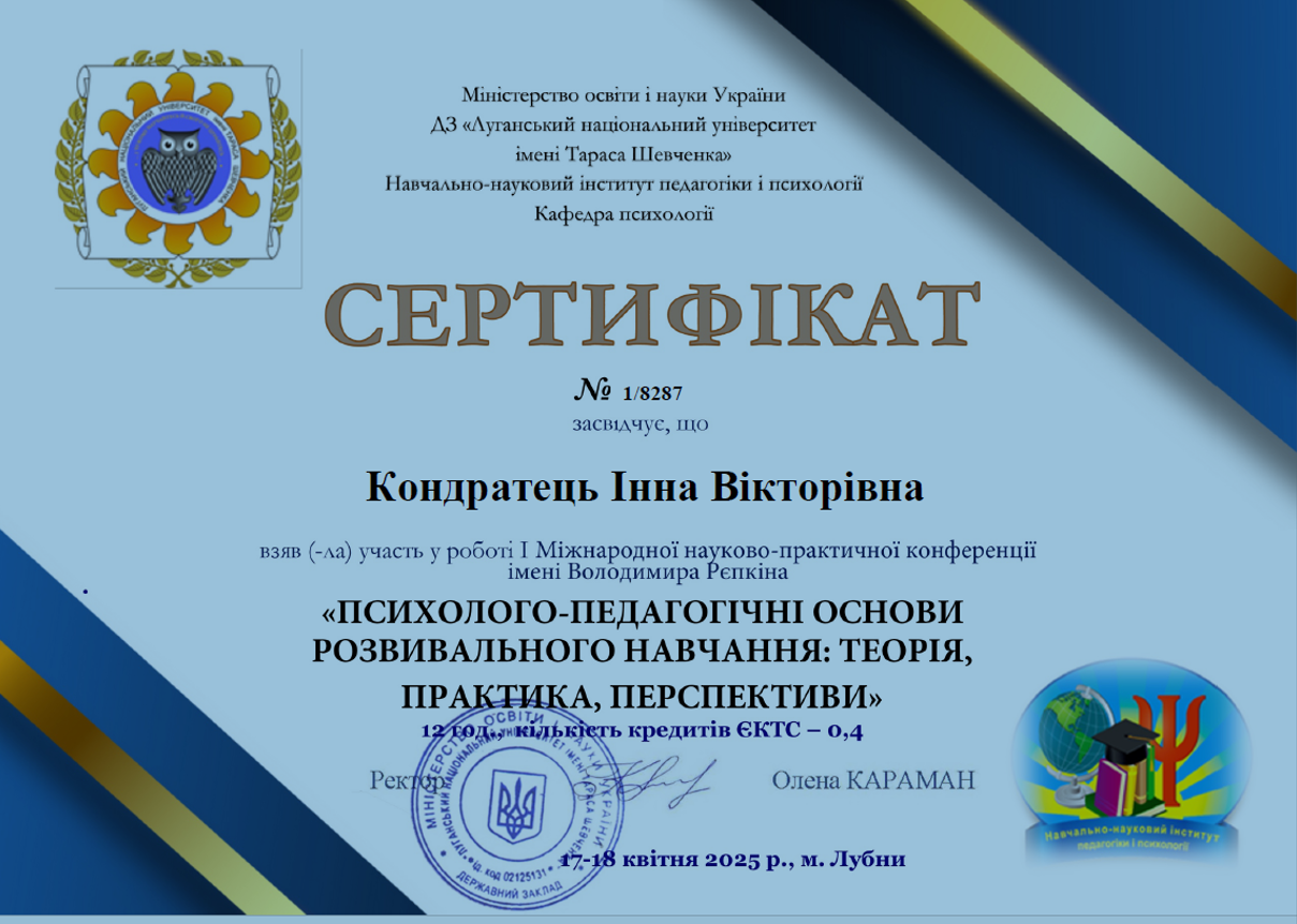 | 12367 | І міжнародна науково-практична конференція імені Володимира Рєпкіна «Психолого-педагогічні основи розвивального навчання: теорія, практика, перспективи» | Використання арттехнік з учасниками освітнього процесу: рефлексійні аспекти | Лубни |