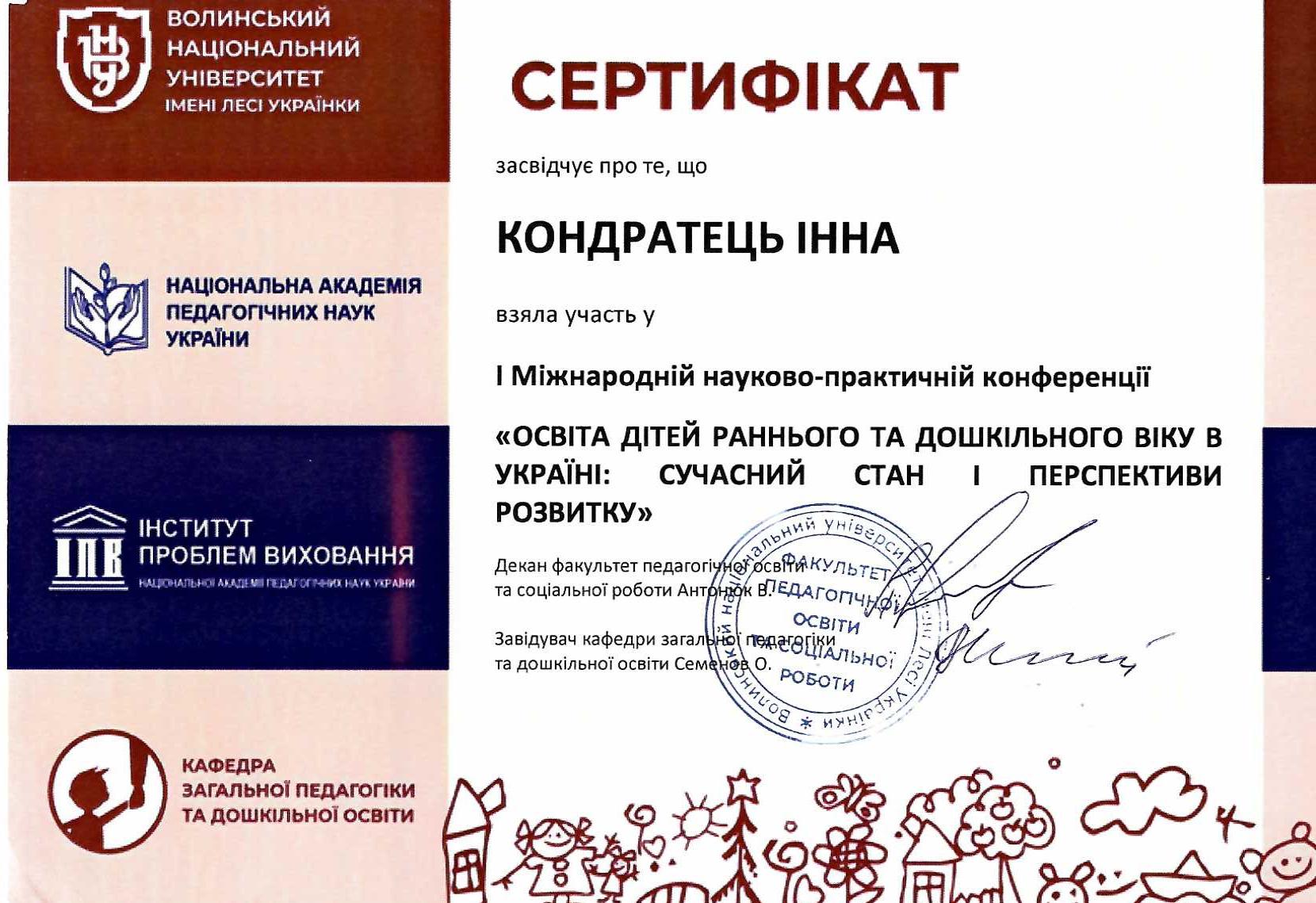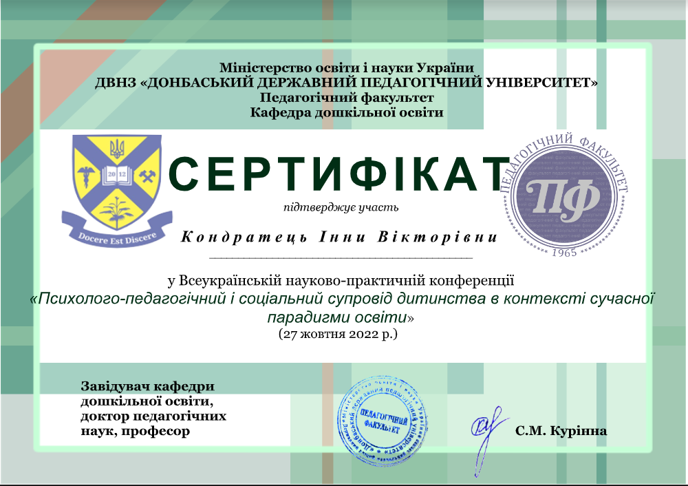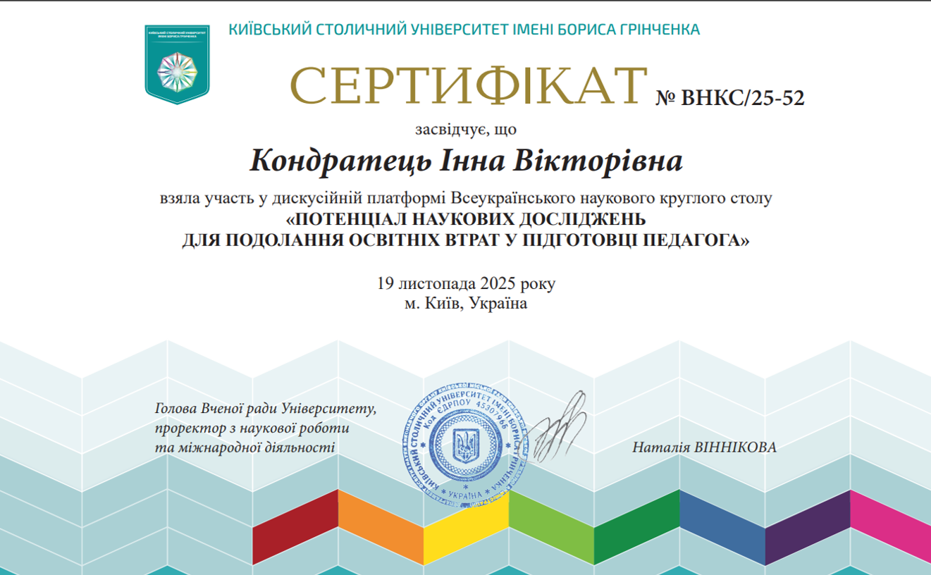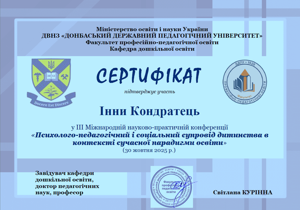 | 181 | Факультет педагогічної освіти | Кафедра дошкільної освіти | 26 | 2 | 2025 | https://www.researchgate.net/profile/Inna_Kondratec |
