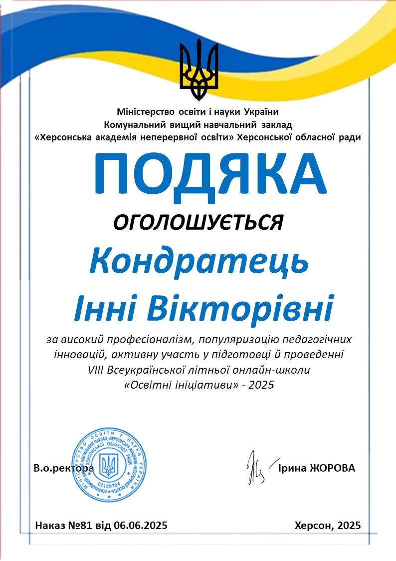 | 12010 | VIII Всеукраїнська літня онлайн-школа "Освітні ініціативи" | Виховуємо допитливого читача : взаємодія педагогів і батьків | Херсон |