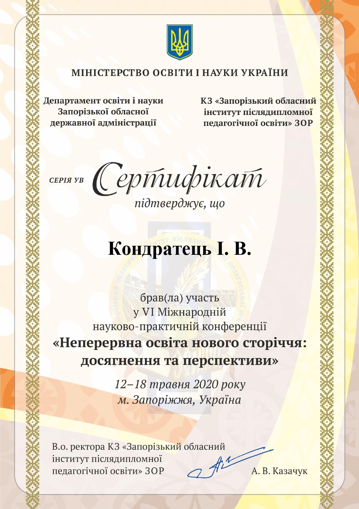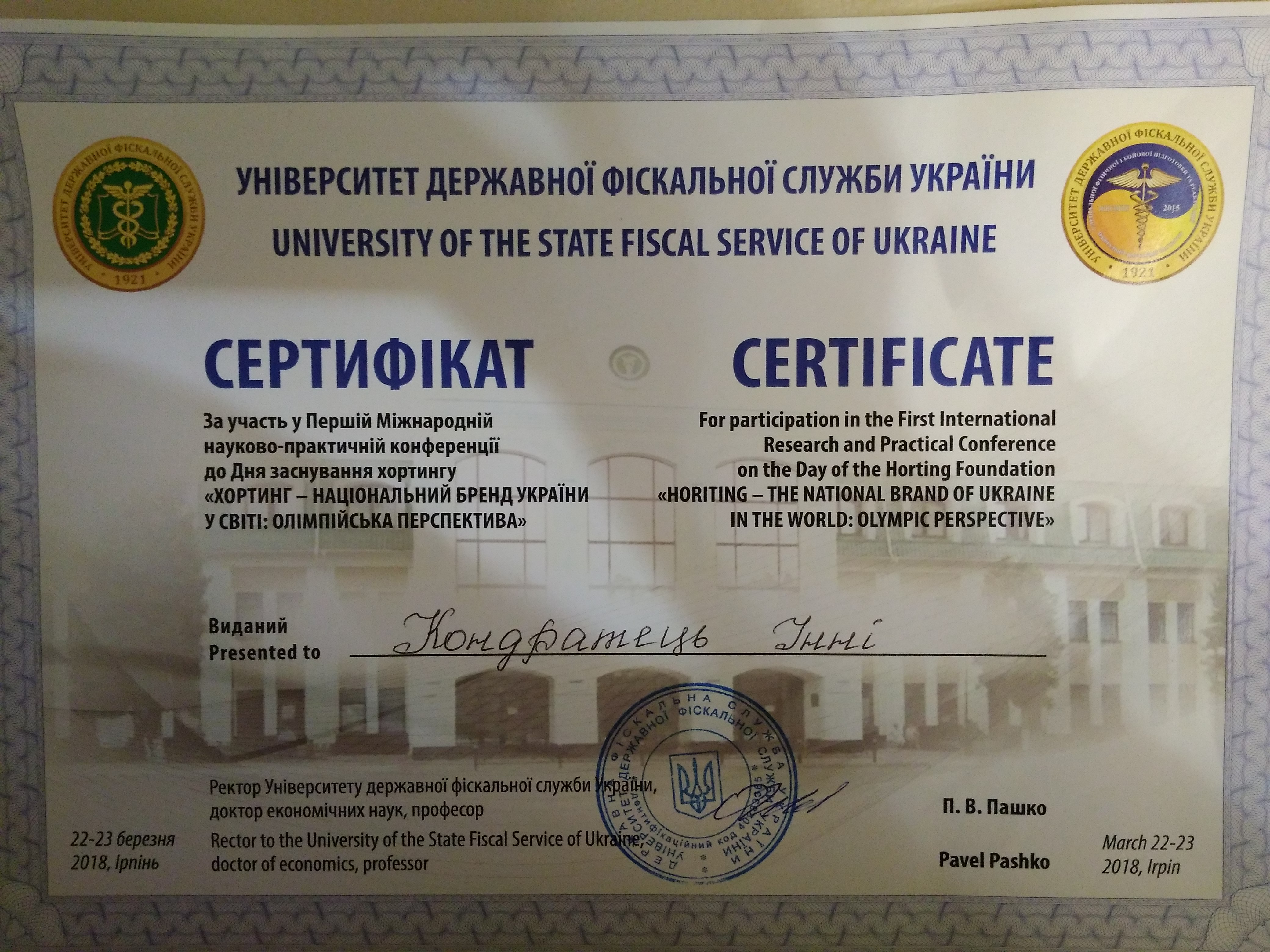 | ID | Назва | Тема доповіді | Місце проведення | Документ, що засвідчує | Дата проведення |