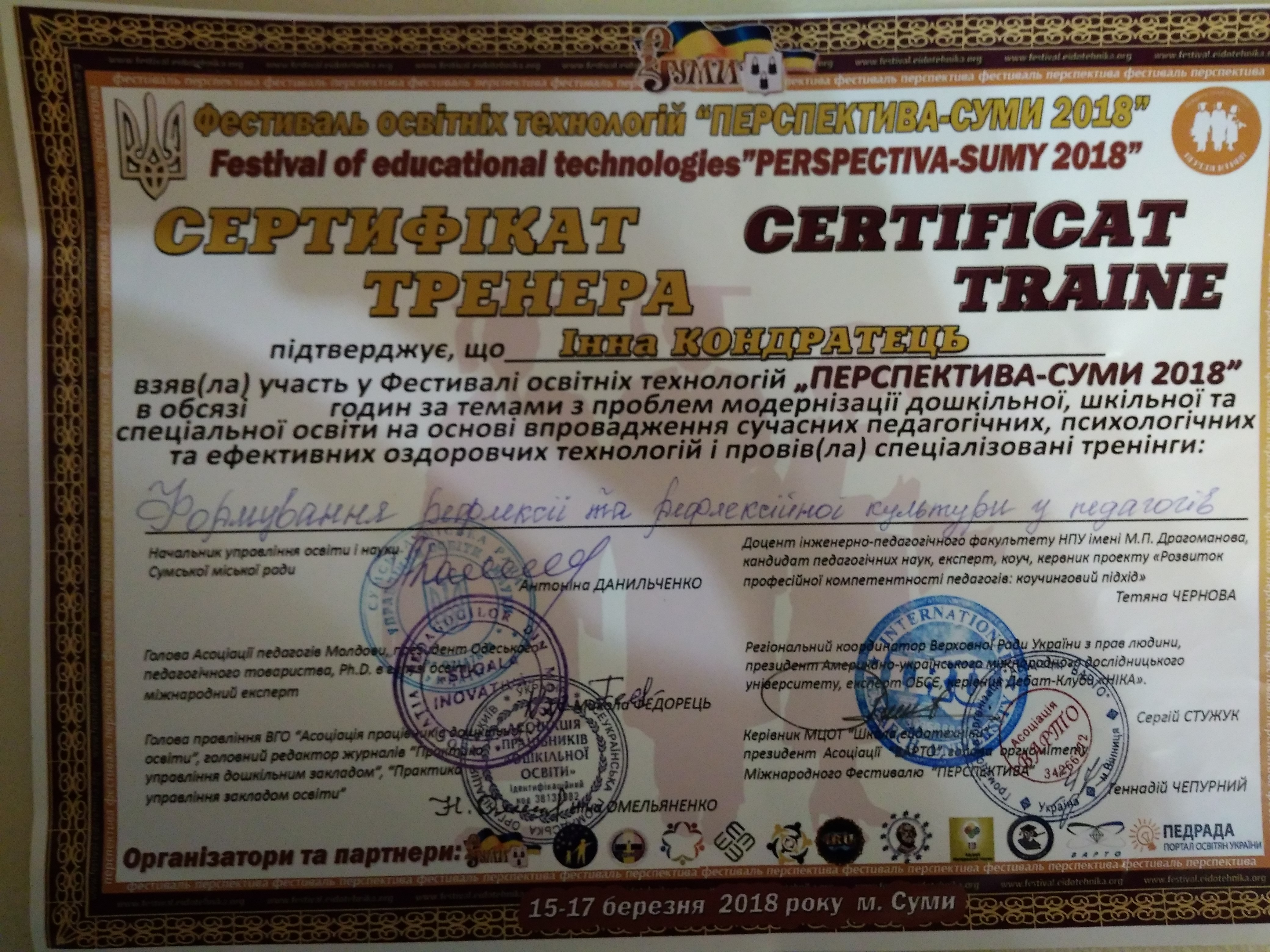 | 3866 | Фестиваль освітніх технологій "Перспектива | Формування рефлесії та рефлексійної культури в педагогів. | Суми |