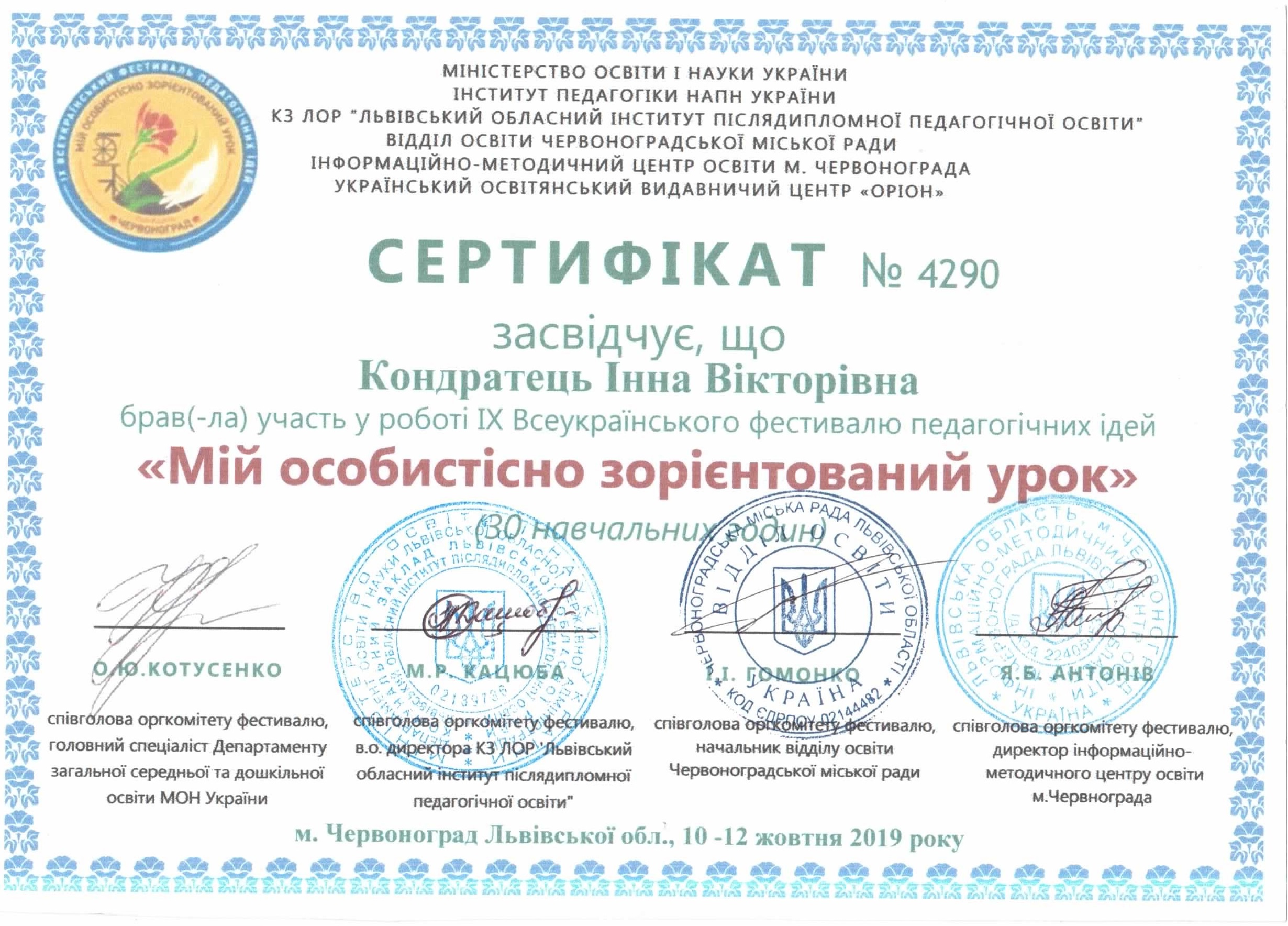 | 4860 | Всеукраїнський фестиваль педагогічних ідей | Філософія рефлексії: особливості використання в педагогічниій діяльності | м. Червоноград |
