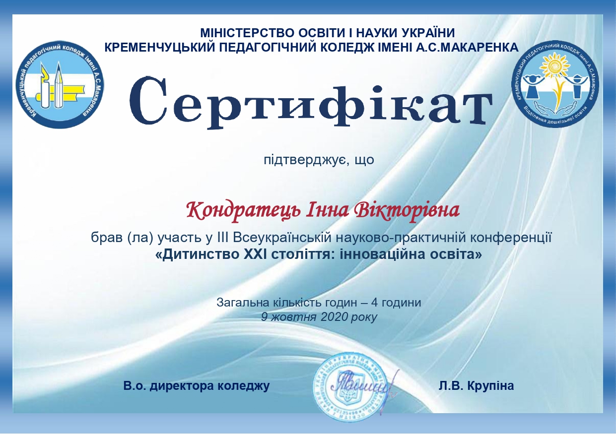 | 7274 | Дитинство XXI століття: інноваційна освіта | Програма «Дитина 2020»: вектори парадигмальних змін | Кременчук | document.pdf | |