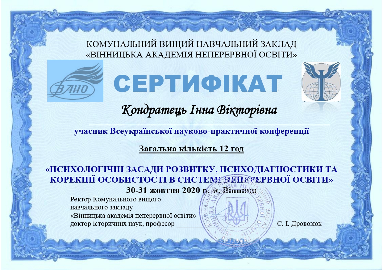| 5628 | Всеукраїнська науково-практична конференція "Психологічні засади розвитку, психодіагностика та корекція особистості в системі неперервної освіти" | Особливості формування мистецької компетентності майбутніх вихователів в умовах дистанційного навчання | м. Вінниця |