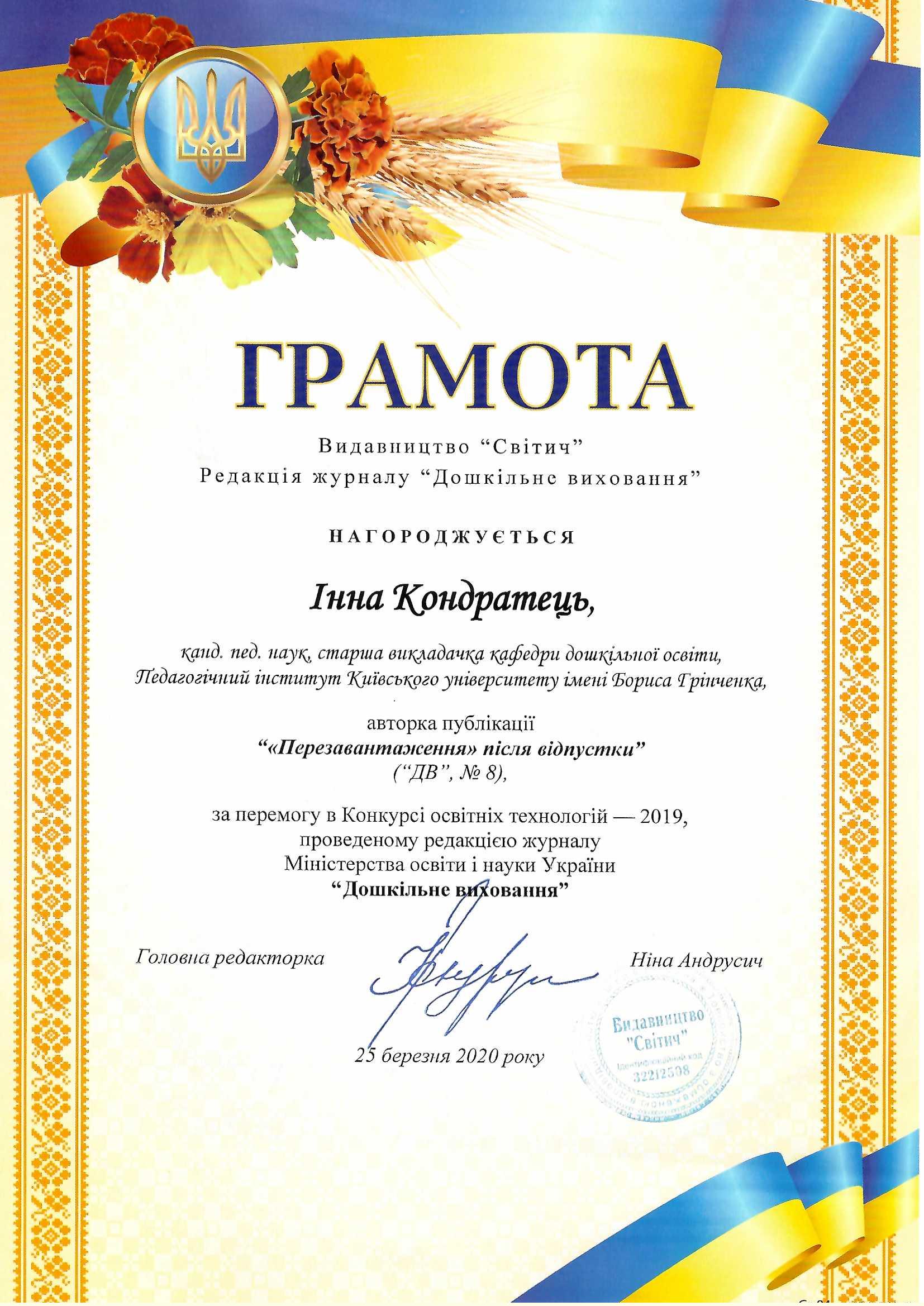 | 5629 | Грамота Видавництво "Свічадо" | "Перезавантаження" після відпустки | Україна |