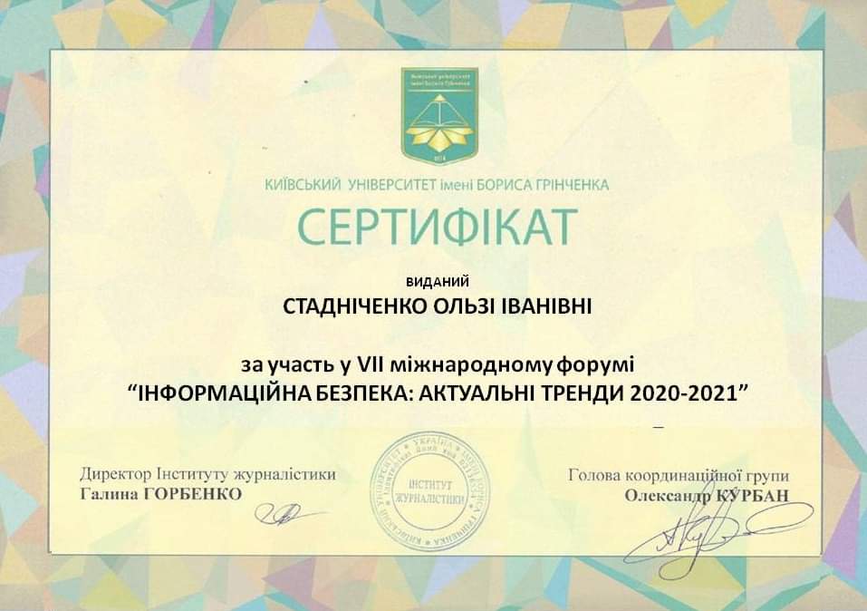| 5718 | Міжнародній науково-практичній онлайн-конференції "Медіазнавчі студії в європейському діалозі: освітній та науковий дискурси". | Інформаційний тероризм як інструмент впливу у глобалізованому світі | Київ | document.pdf | |