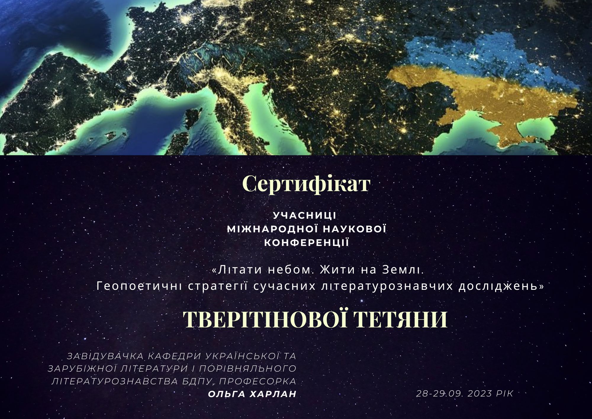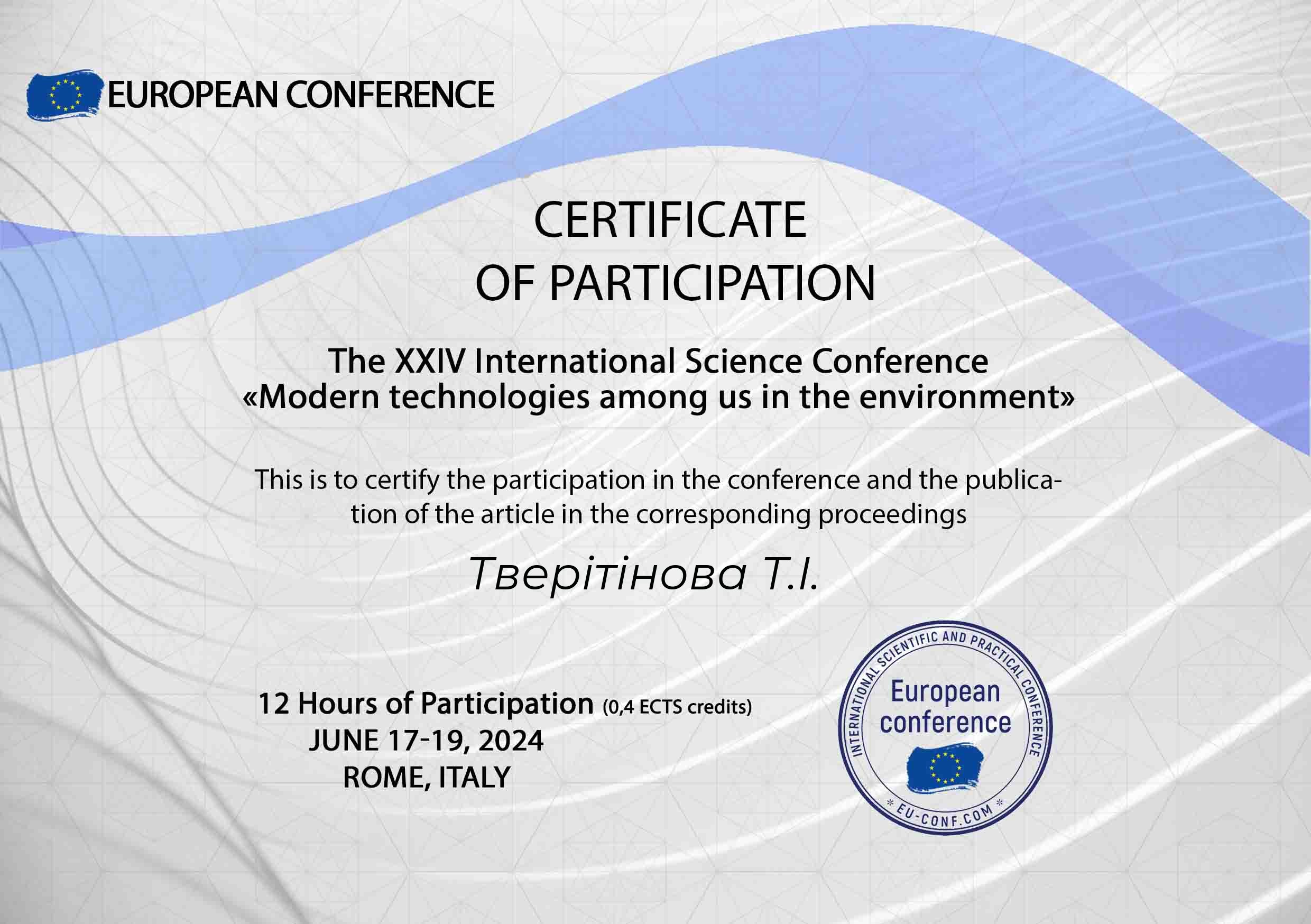 | 10602 | XXIV International Scientific and Practical Conference «Modern technologies among us in the environment» | «Проблема «Інший» / «Інакший» в романі Д. Ріс «Широке Саргасове море» | Rome, Italy |