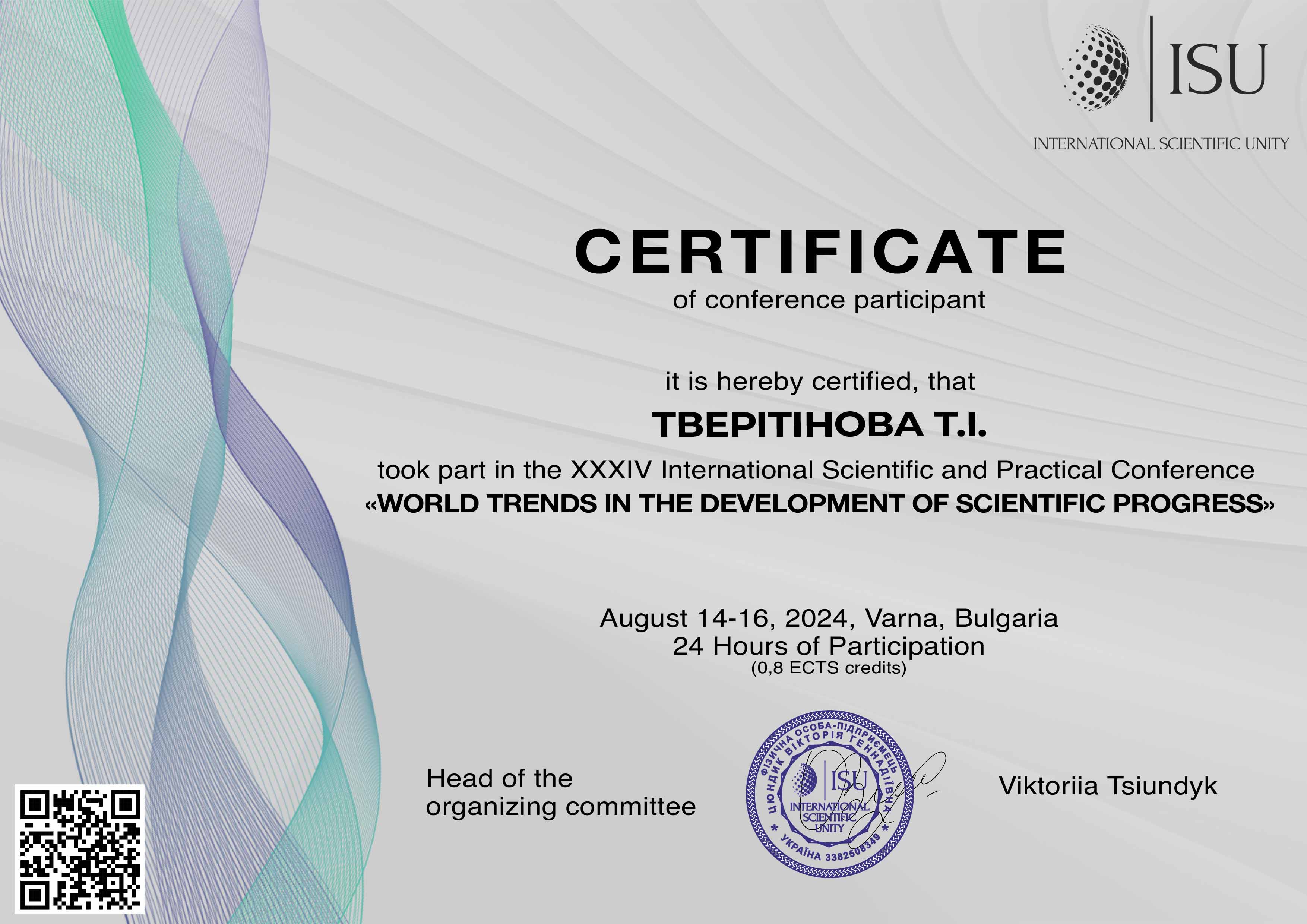 | 10674 | XXXІV International scientific and practical conference «World Trends in the Development of Scientific Progress» | Поліжанровість в романі Ю. Вінничука "Аптекар" | Varna, Bulgaria |