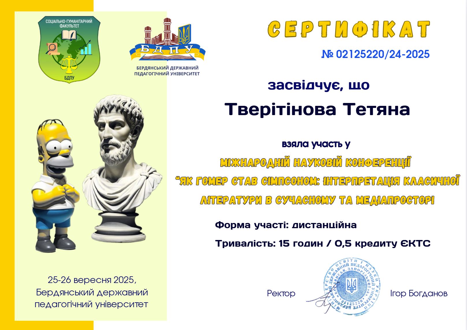 | 34 | Факультет української філології, культури і мистецтва | Кафедра світової літератури | 30.8 | 1 | 2025 | https://www.researchgate.net/profile/Tetiana_Tveritinova |