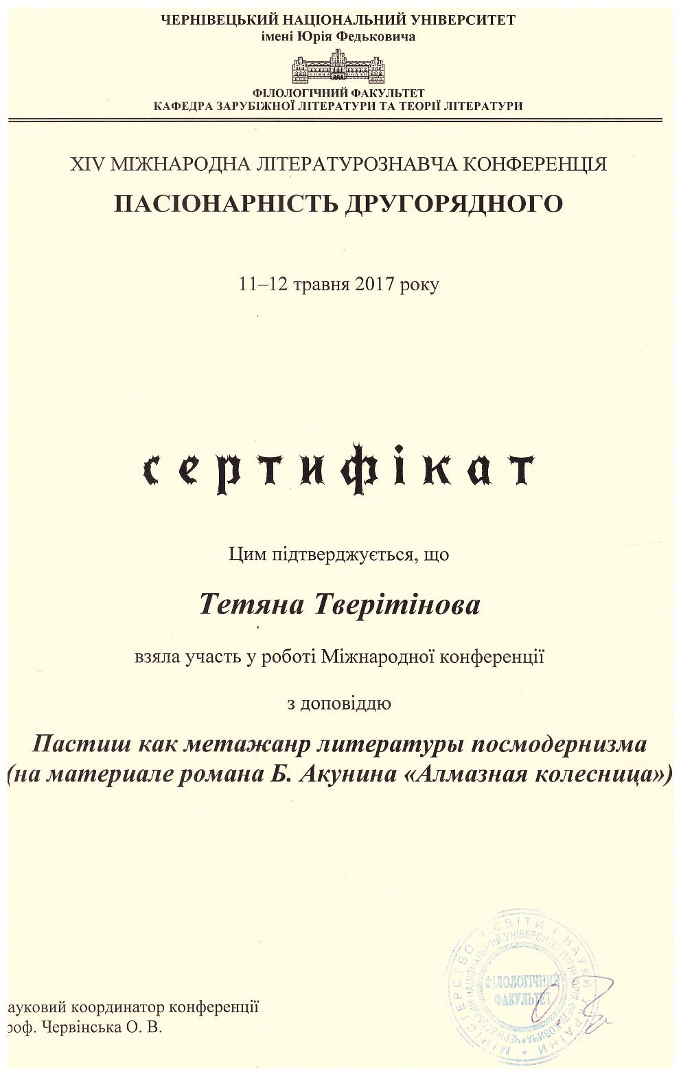 | 2512 | ХІV Міжнародна конференція "Пасіонарність другорядного" | Пастиш как метажанр литературы постмодернизма | м. Чернівці, Чернівецький національний університет |