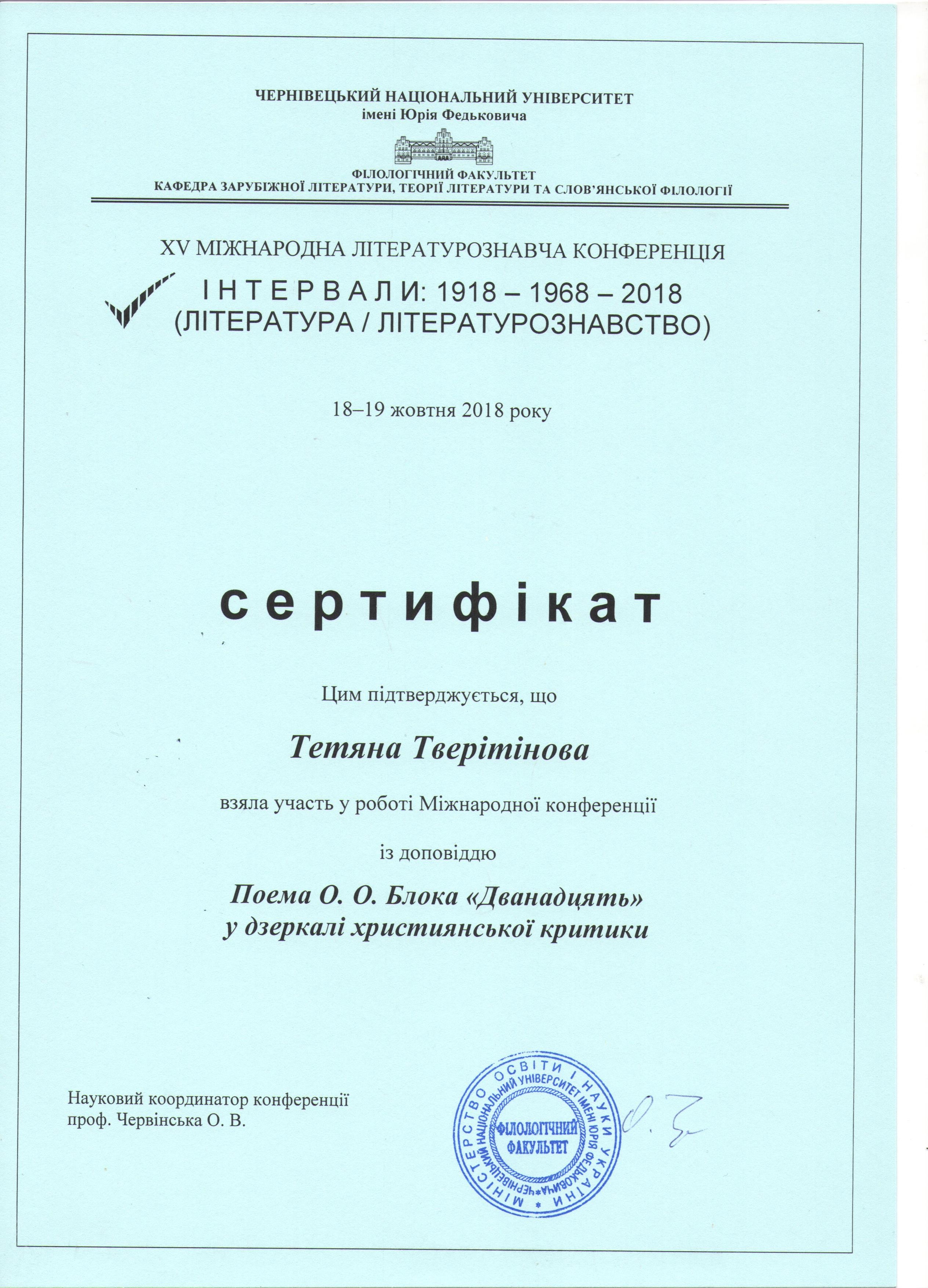 | 3382 | Інтервали: 1918-1968-2018 (література/літературознавство) | Поема О. Блока "Дванадцять" у дзеркалі християнської критики | Чернівецький національний університет імені Ю. Федьковича |