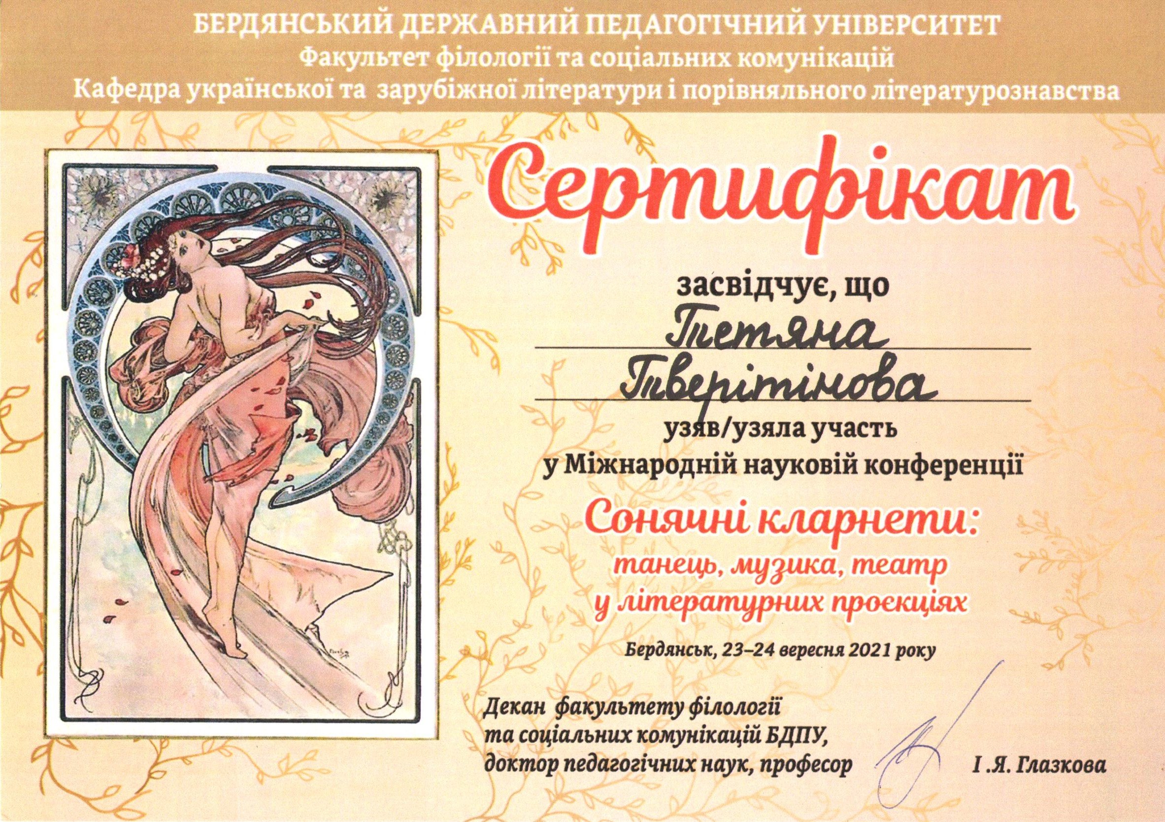 | 7664 | Всеукраїнський літературознавчий круглий стіл "Автор і твір крізь призму ідентичності у світовій літературі: 1821 - 1921 - 2021" | Проблема самоідентичності в книзі "Прокляті поети" П. Верлена | М. Київ, Київський уніеврситет імені Бориса Грінченка | document.pdf | |