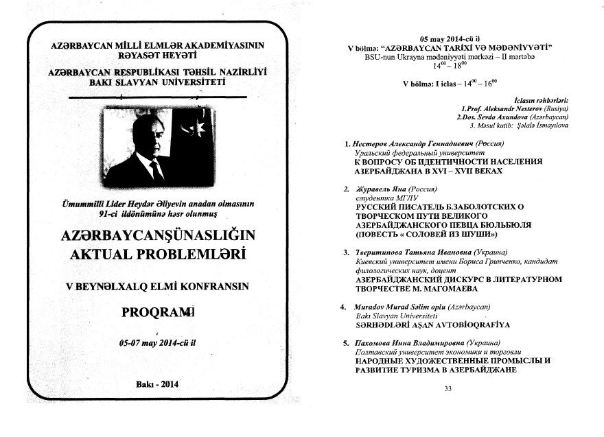 | 751 | Актуальные проблемы азербайджановедения | Азербайджанский дискурс в литературном творчестве М. Магомаева | Бакинский славянский университет, г. Баку, Азербайджан |