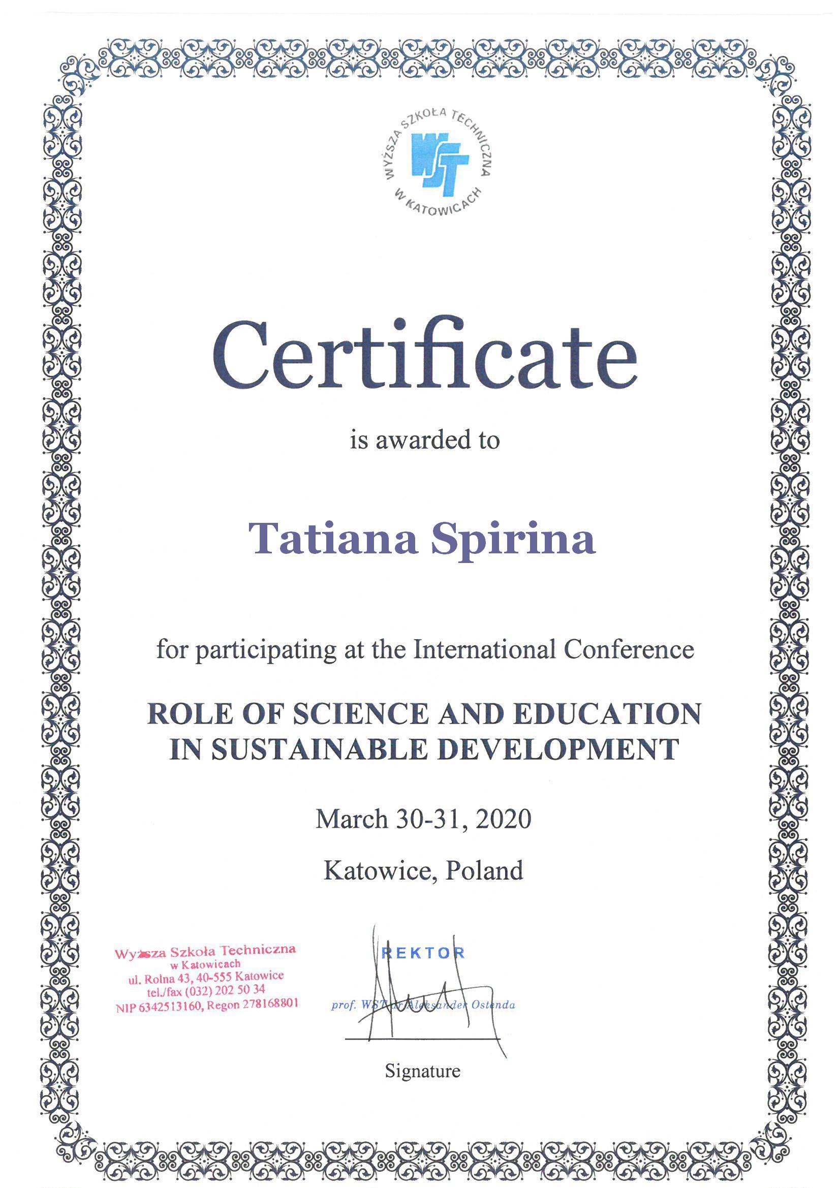 | 5266 | ROLE OF SCIENCE AND EDUCATION IN PROVIDING SUSTAINABLE DEVELOPMENT | AGGRESSIVE BEHAVIOR OF TEENAGERS: CAUSES AND CONSEQUENCES | Katowice, Poland |