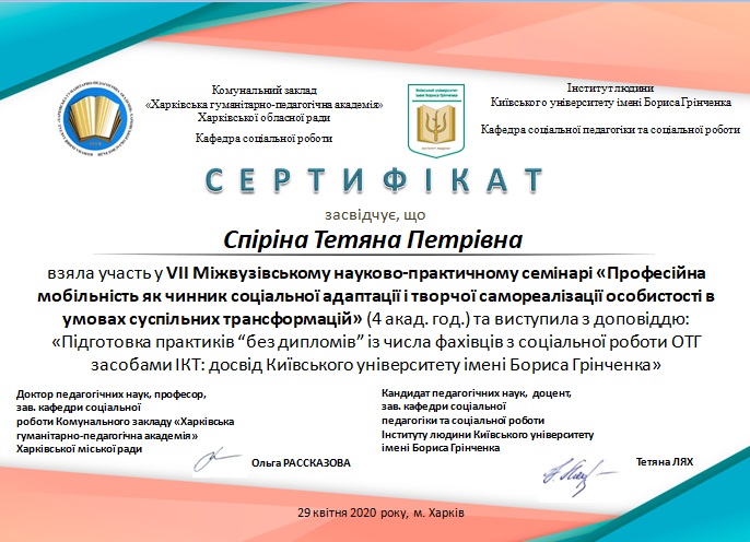 | 5318 | Професійна мобільність як чинник соціальної адаптації і творчої самореалізації особистості в умовах суспільних трансформацій | Підготовка практиків "без дипломів" із числа фахівців з соціальної роботи ОТГ засобами ІКТ: досвід Київського університету імені Бориса Грінченка | Харків |