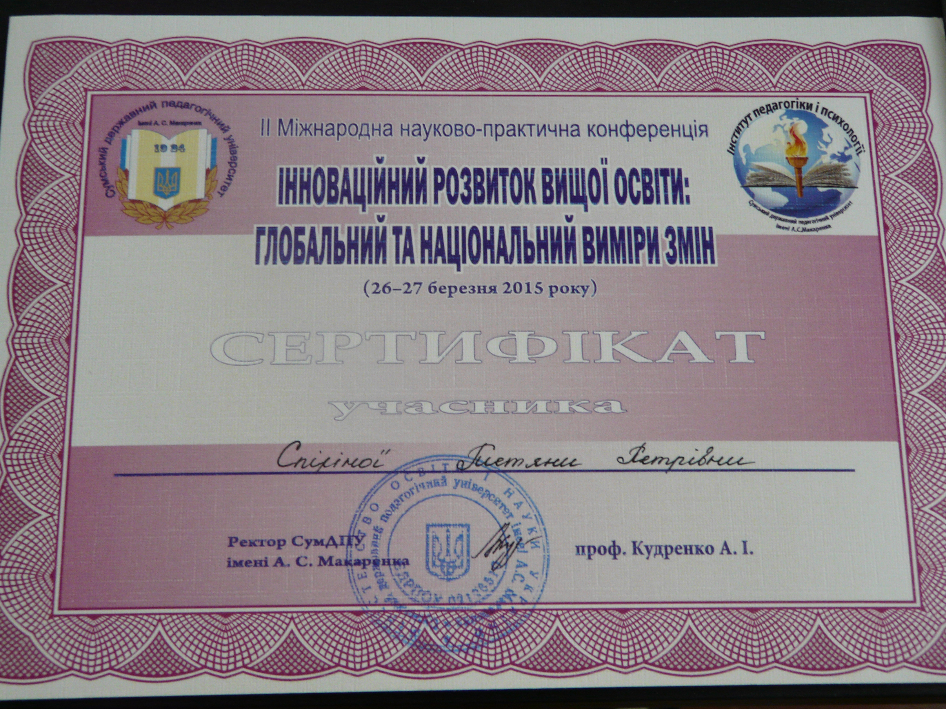 | ID | Назва | Тема доповіді | Місце проведення | Документ, що засвідчує | Дата проведення |