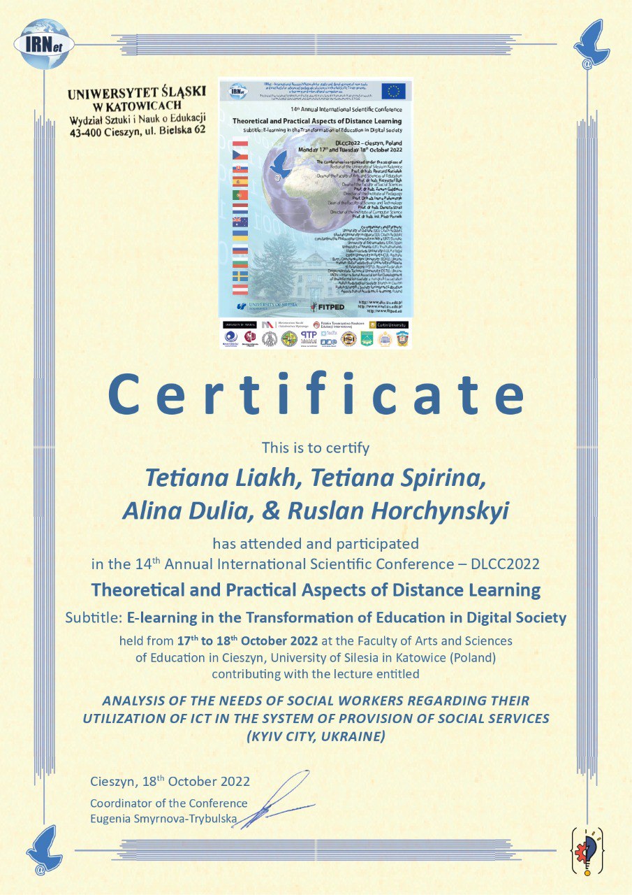 | 8319 | "Theoretical and Practical Aspects of Distance Learning”, Subtitle “E-learning in the Transformation of Education in Digital Society” (DLCC2022 conference) | Professional self-improvement of social workers in working with female combatants: the potential of the МООС | Cieszyn, Poland |