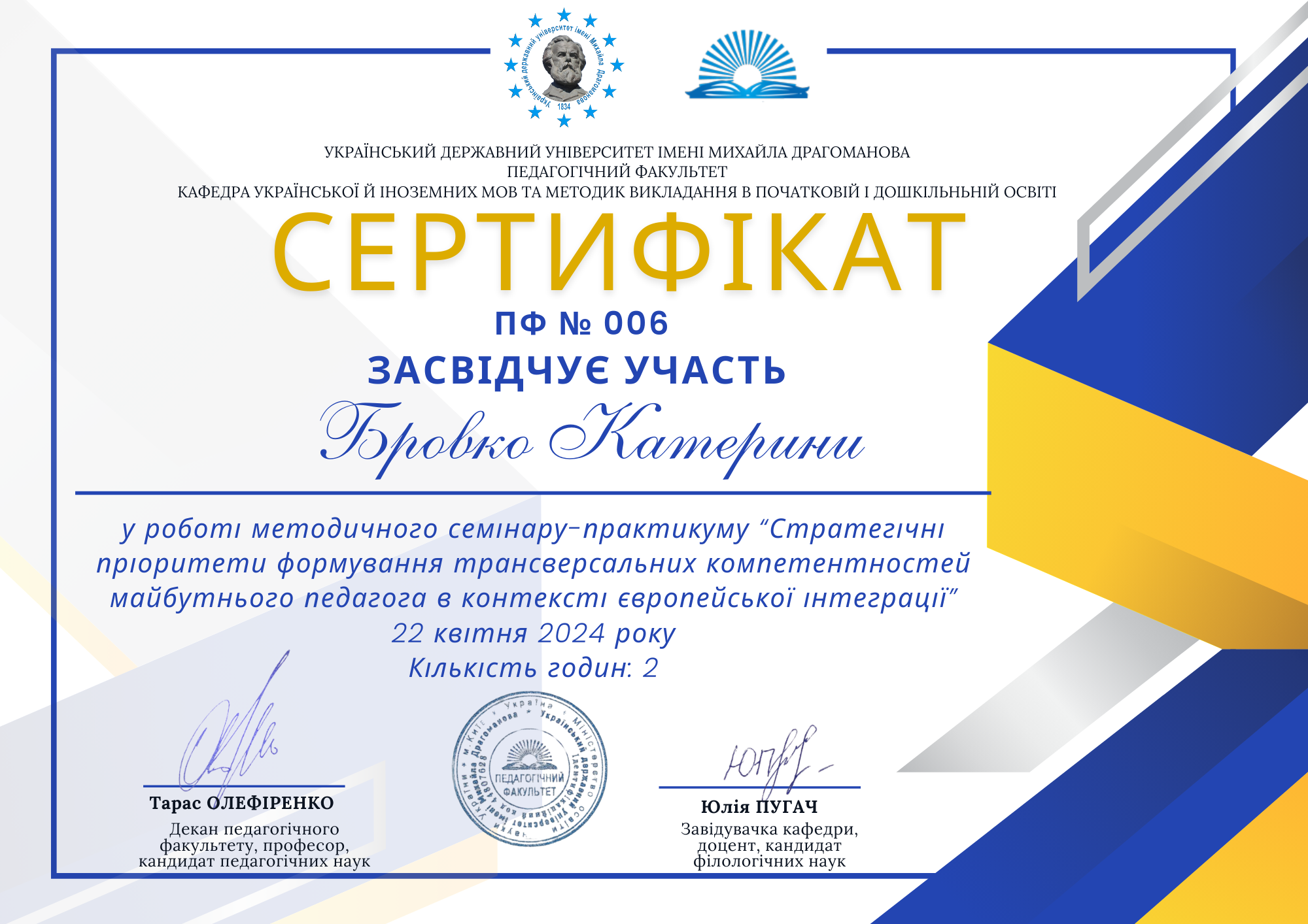 | 10313 | Методичний семнар-практикум "Стратегічні пріоритети формування трансверсальних компетентностей майбутнього педагога в контексті європейської інтеграції" | - | Національний педагогічний університет імені М.П. Драгоманова, м. Київ, Україна |