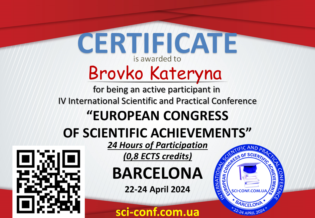 | 10314 | IV Міжнародна науково-практична конференція «European Congress of Scientific Achievements» | Лайфхаки іншомовного інформаційно-освітнього простору як запорука ефективності формування пізнавальної спрямованості студентів університету | Barselona, Spain |