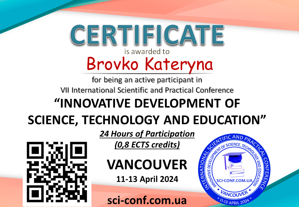| 10315 | INNOVATIVE DEVELOPMENT OF SCIENCE, TECHNOLOGY AND EDUCATIONV | ІКТ як каталізатор формування пізнавальної спрямованості студентів університету до вивчення ІМ | Vancouver, Canada |