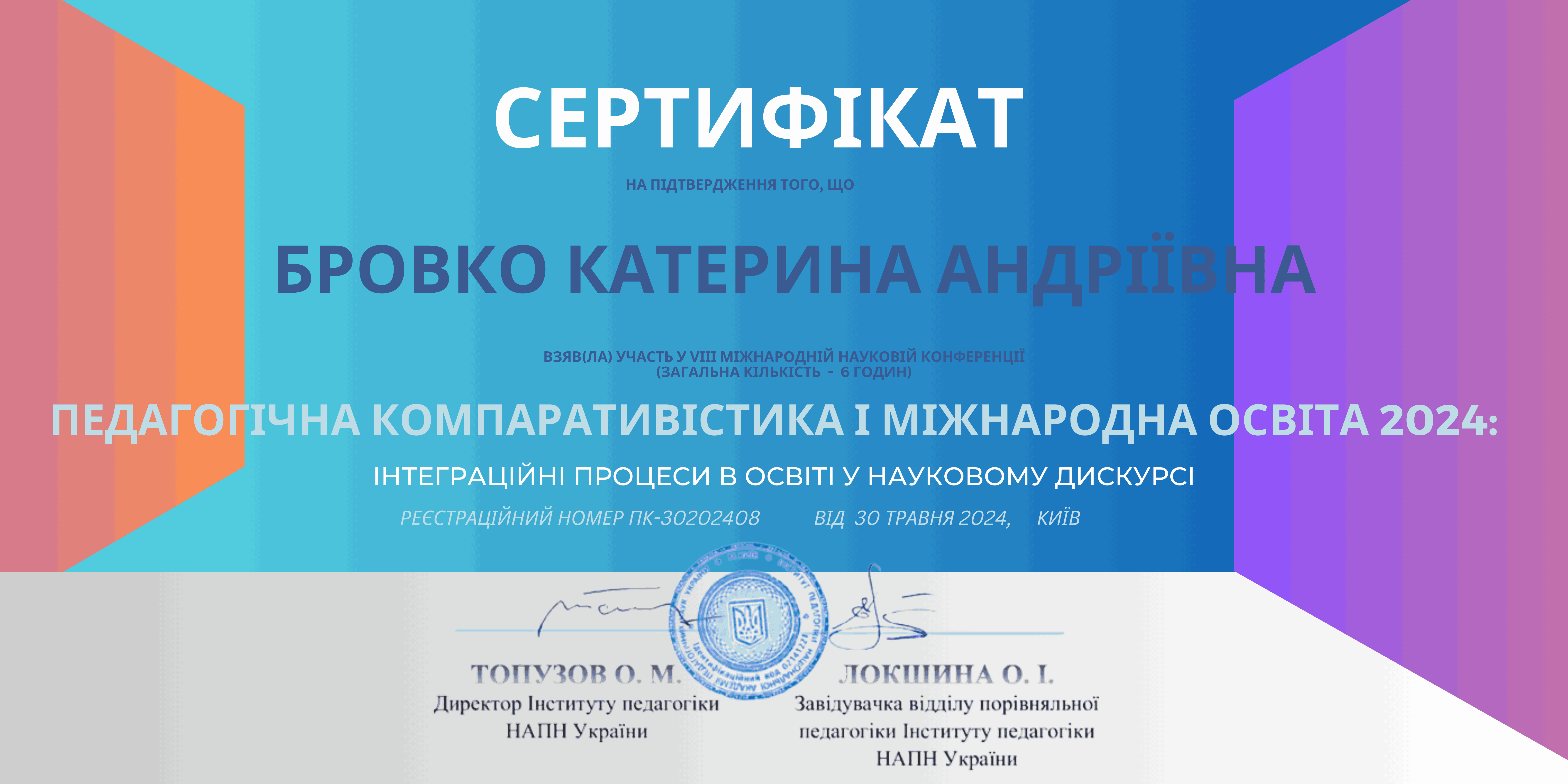 | 10692 | COMPARATIVE AND INTERNATIONAL EDUCATION 2024 VIІІ Міжнародна наукова конференція / VІІI International scientific conference | Організаційно-педагогічні умови формування пізнавальної спрямованості студентів університету в процесі вивчення ІМ засобами ІКТ | Інститут педагогіки НАПН України, м. Київ |
