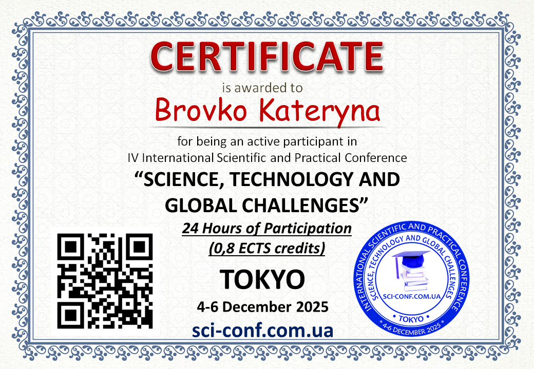 | 12624 | IV Міжнародна науково-практична конференція «SCIENCE, TECHNOLOGY AND GLOBAL CHALLENGES» | Створення віртуального середовища для формування пізнавальної спрямованості студентів університету до вивчення іноземної мови | Токіо, Японія |