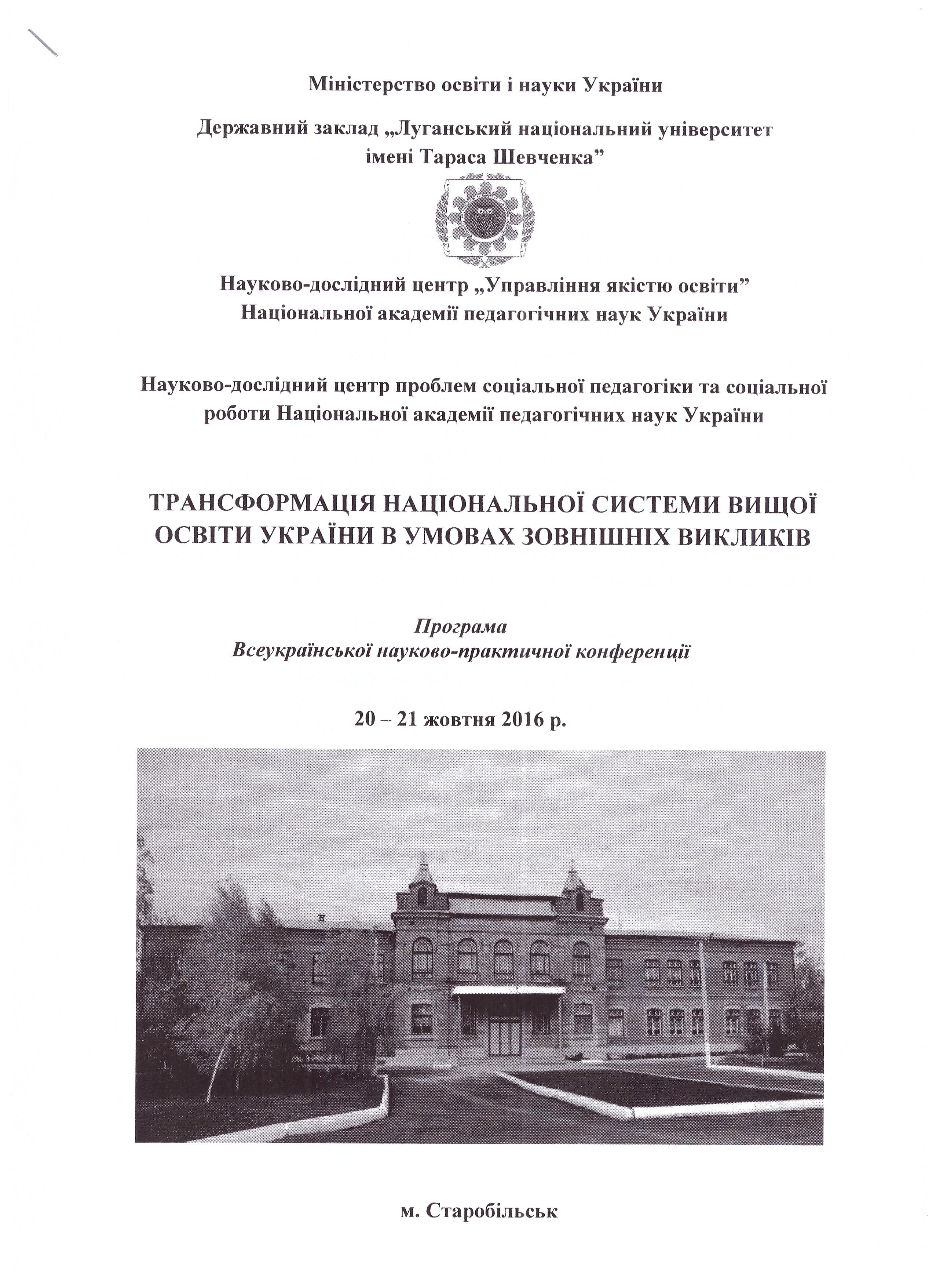 | 4125 | Всеукраїнська науково-практична конференція «Трансформація національної системи вищої освіти України в умовах зовнішніх викликів» | Сутнісні характеристики феномену корпоративна культура особистості | Старобільськ, ЛНУ ім. Тараса Шевченка |