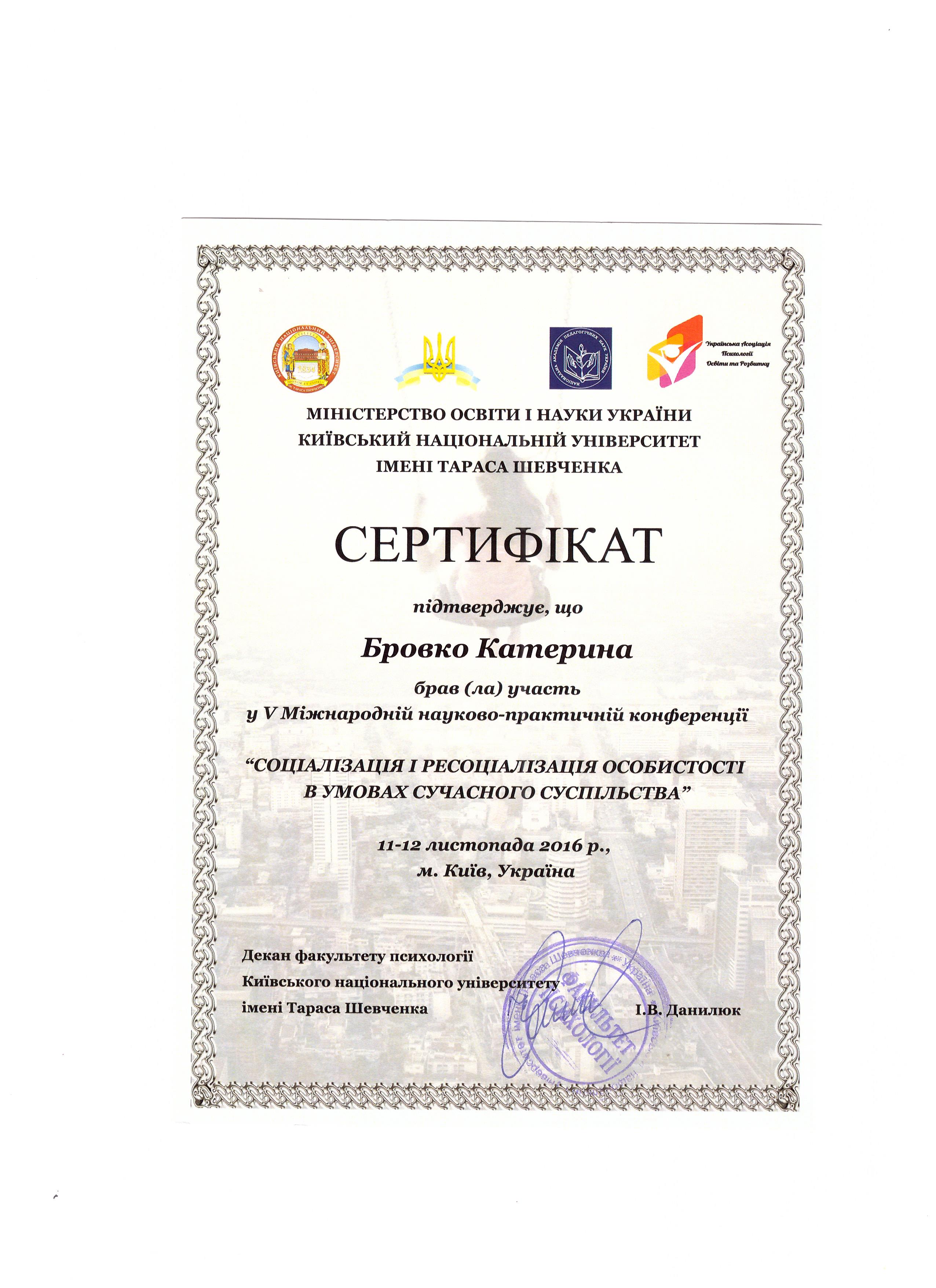 | 4127 | V Міжнародна науково-практична конференція «Соціалізація і ресоціалізація особистості в умовах сучасного суспільства» | Позааудиторна діяльність університету як регулятор соціального розвитку студентської молоді | м. Київ, КУ ім. Тараса Шевченка |