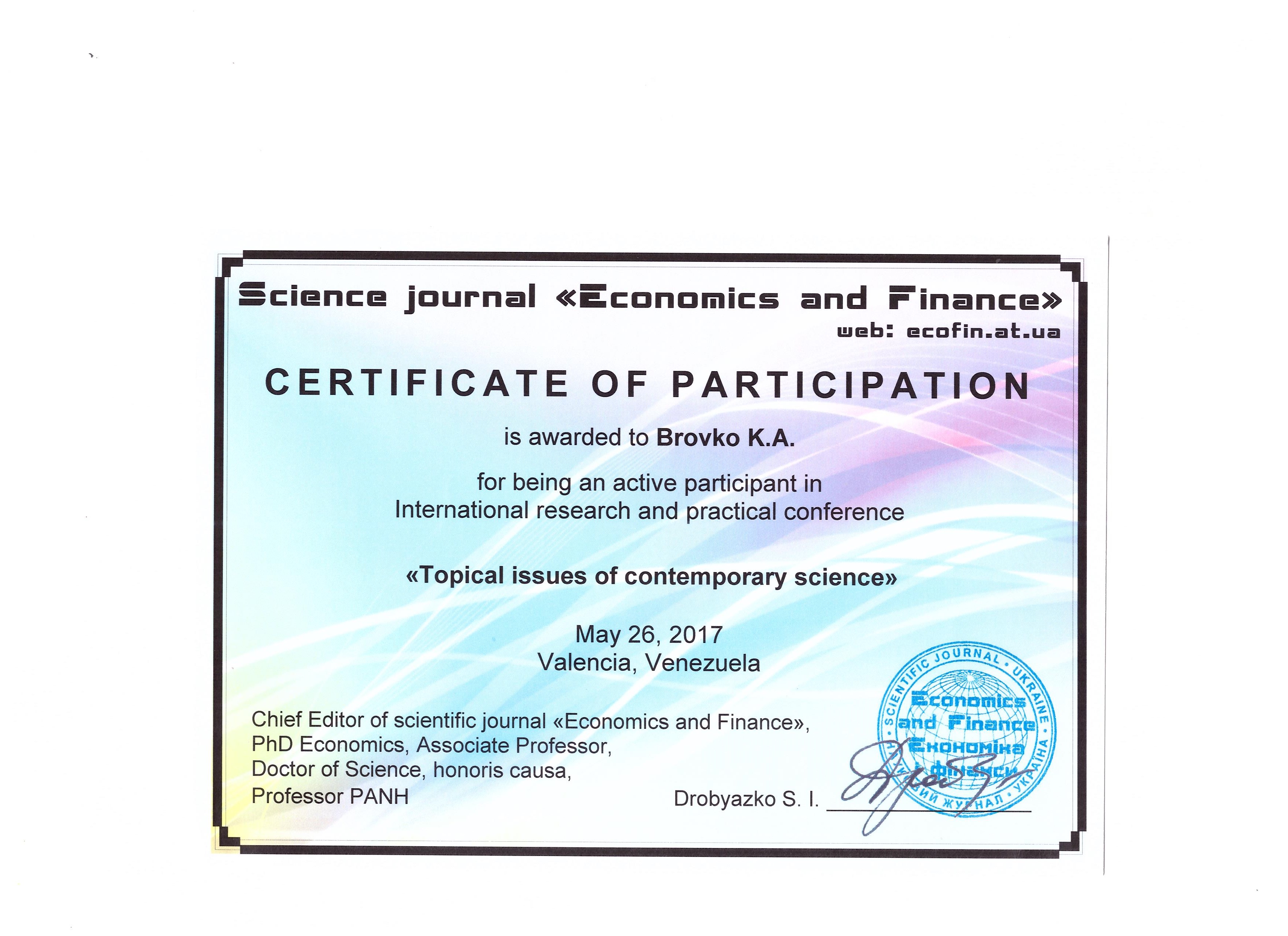| 4130 | Міжнародна наук.-практ. конференція «Topical issues of contemporary science» | Формування корпоративної культури особистості: психологічні аспекти | Valencia, Venezuela |