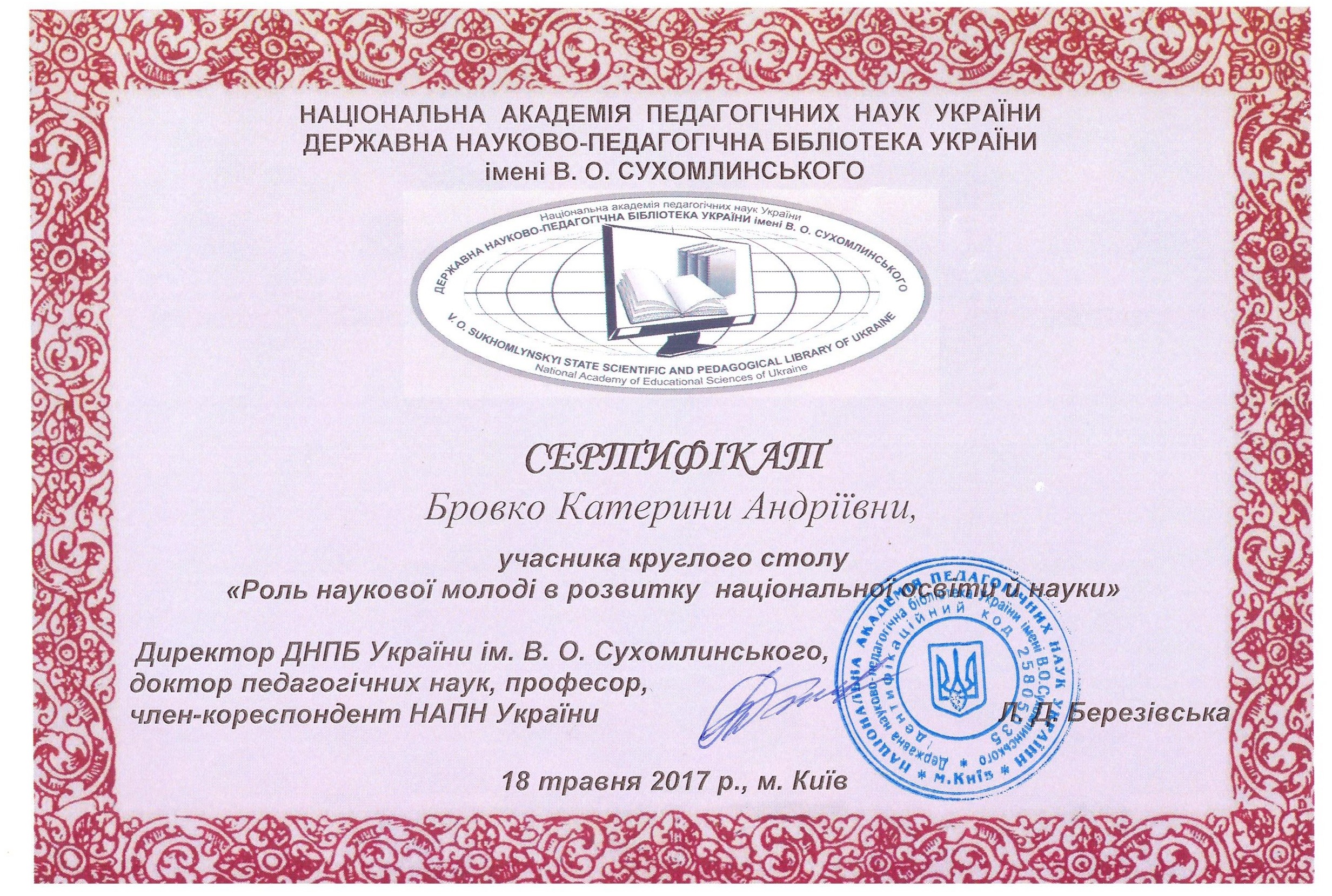 | 4132 | Круглий стіл «Роль наукової молоді в розвитку національної освіти й науки» | Досвід формування корпоративної культури в університетах Європи | м. Київ, Державна науково-педагогічна бібліотека України імені В.О. Сухомлинського |