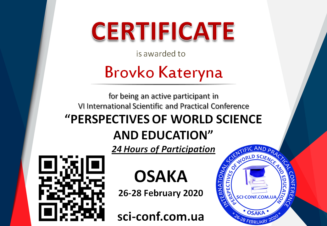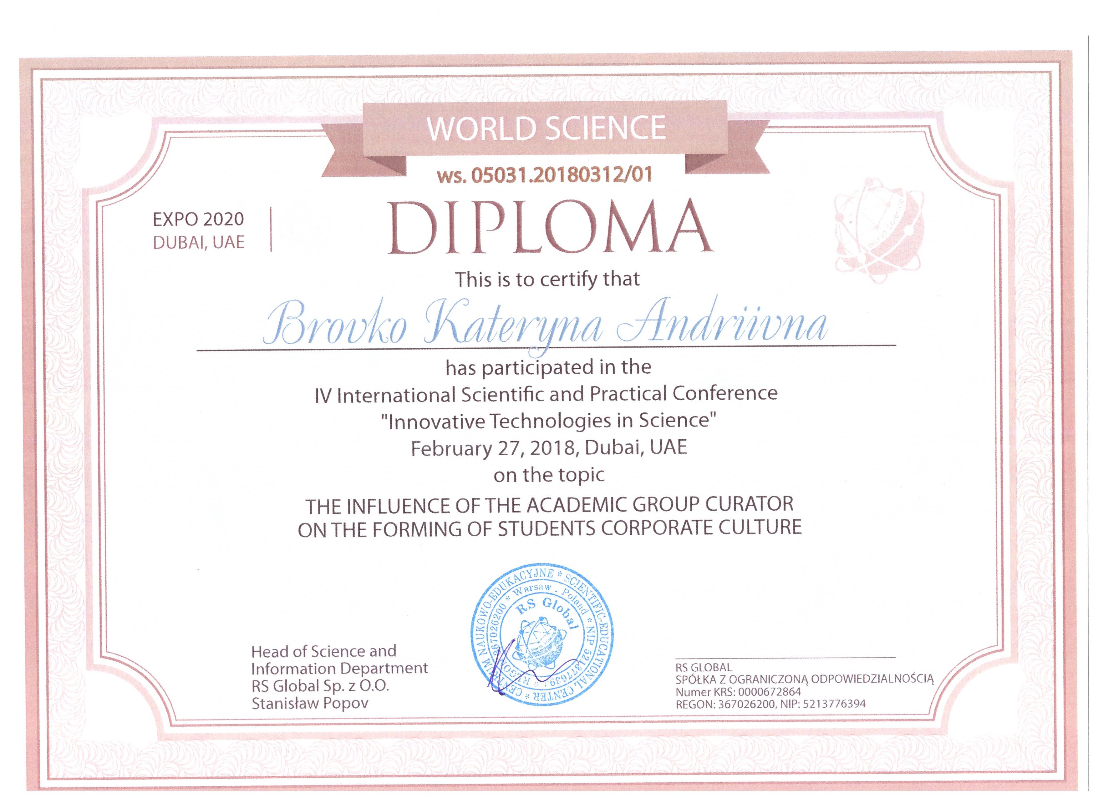 | 4135 | V International Scientific and Practical Conference «The goals of the World Science 2018» | Вплив куратора академічної групи на формування корпоративної культури студентів | Dubai, UAE |