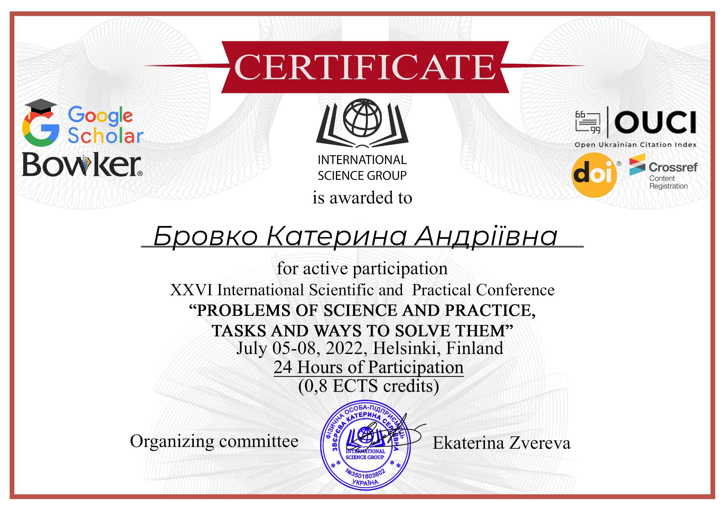 | 8416 | XXVI Міжнародна науково-практична конференція «Problems of science and practice, tasks and ways to solve them» | Методика навчання іноземної мови учнів 4-х класів із застосуванням технології Web 3.0. | Гельсінкі, Фінляндія |